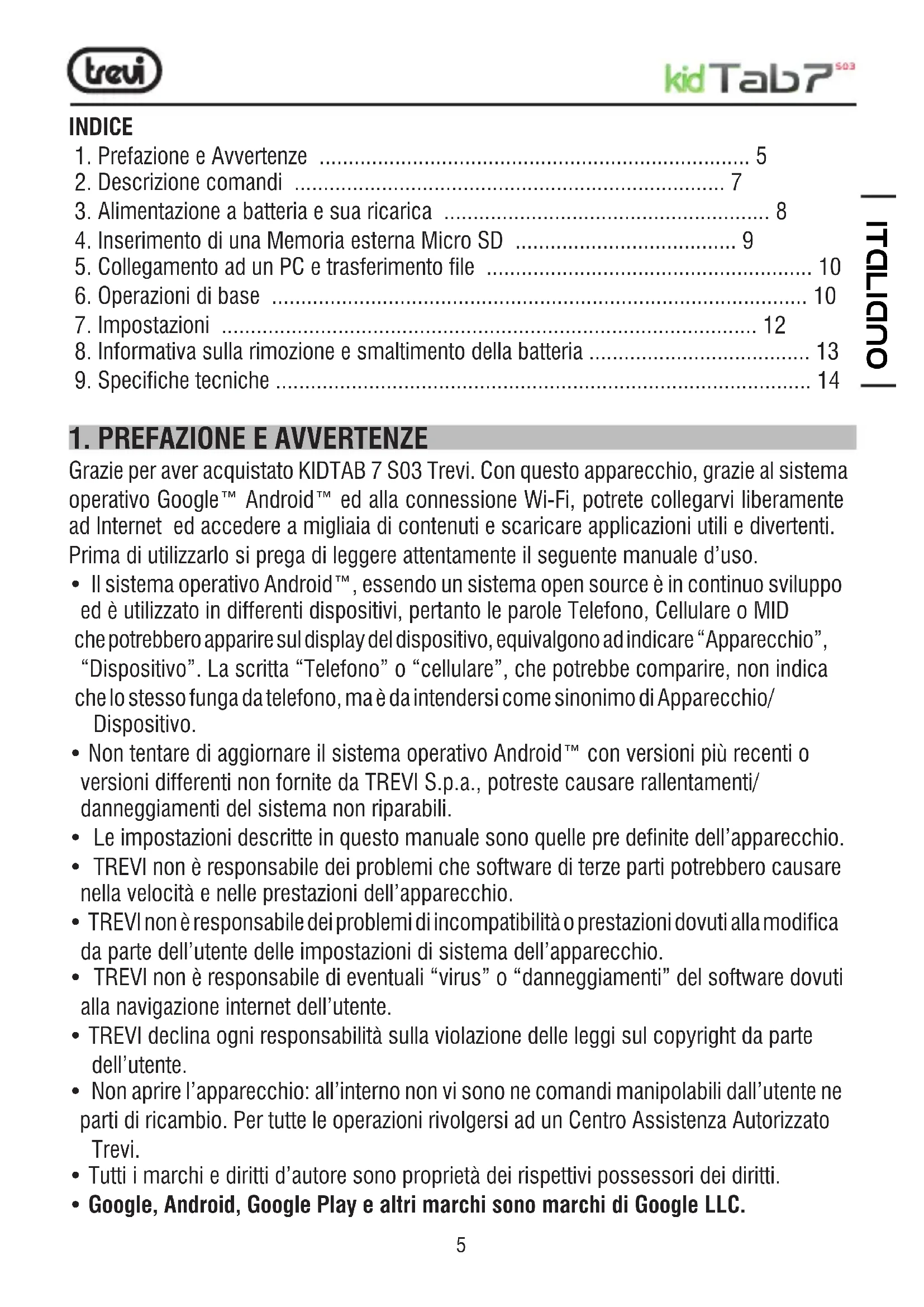 Grazie per aver acquistato KIDTAB 7 S03 Trevi. Con questo apparecchio, grazie al sistema operativo Google™ Android™ ed alla connessione Wi-Fi, potrete collegarvi liberamente ad Internet ed accedere a migliaia di contenuti e scaricare applicazioni utili e divertenti. Prima di utilizzarlo si prega di leggere attentamente il seguente manuale d’uso.