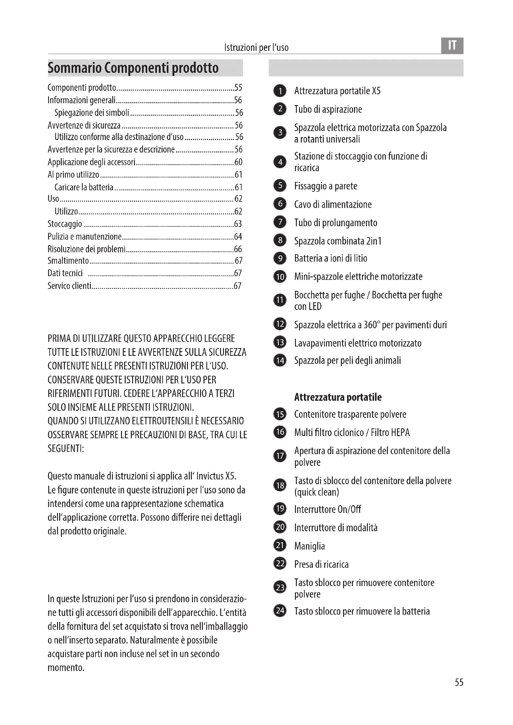In queste Istruzioni per l’uso si prendono in considerazio- ne tutti gli accessori disponibili dell’apparecchio. L‘entità della fornitura del set acquistato si trova nell‘imballaggio o nell‘inserto separato. Naturalmente è possibile acquistare parti non incluse nel set in un secondo momento. Sommario Componenti prodotto
