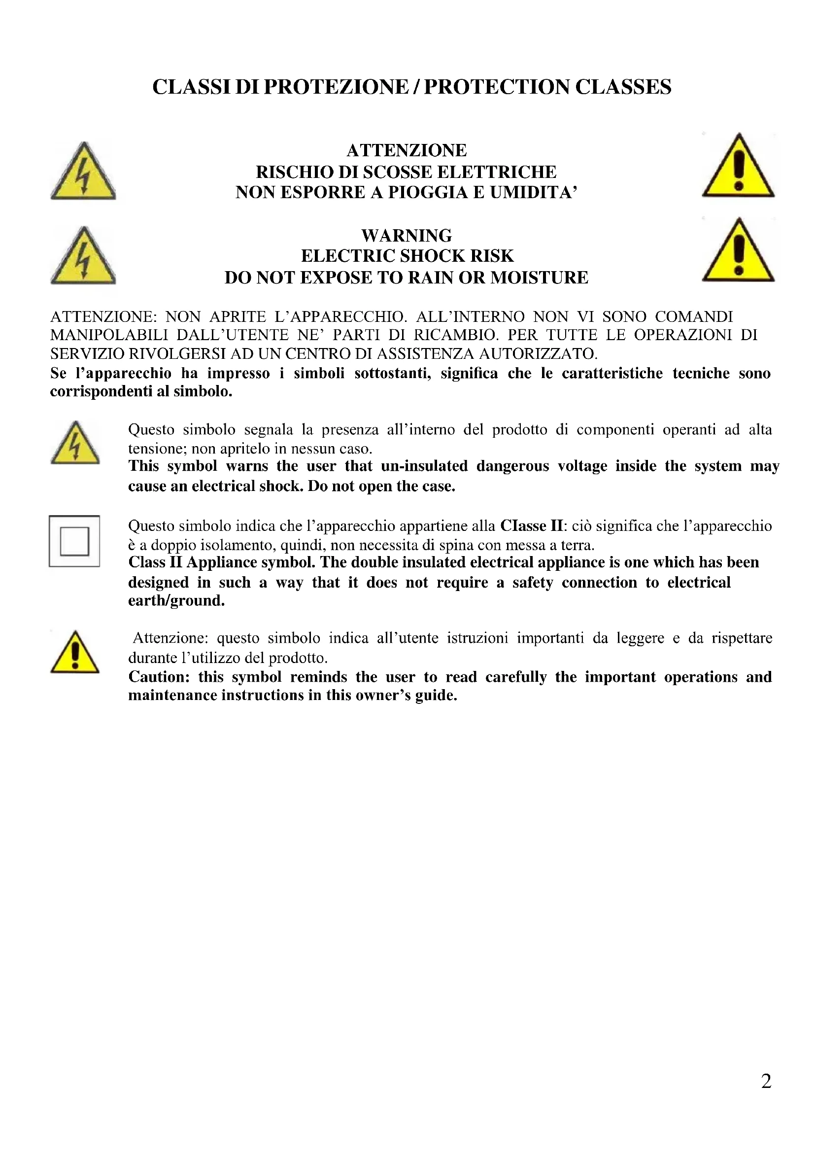 DO NOT EXPOSE TO RAIN OR MOISTURE ATTENZIONE: NON APRITE L’APPARECCHIO. ALL’INTERNO NON VI SONO COMANDI MANIPOLABILI DALL’UTENTE NE’ PARTI DI RICAMBIO. PER TUTTE LE OPERAZIONI DI SERVIZIO RIVOLGERSI AD UN CENTRO DI ASSISTENZA AUTORIZZATO. Se l’apparecchio ha impresso i simboli sottostanti, significa che le caratteristiche tecniche sono corrispondenti al simbolo. Questo simbolo segnala la presenza all’interno del prodotto di componenti operanti ad alta tensione; non apritelo in nessun caso. This symbol warns the user that un-insulated dangerous voltage inside the system may cause an electrical shock. Do not open the case. Questo simbolo indica che l’apparecchio appartiene alla CIasse II: ciò significa che l’apparecchio è a doppio isolamento, quindi, non necessita di spina con messa a terra. Class II Appliance symbol. The double insulated electrical appliance is one which has been designed in such a way that it does not require a safety connection to electrical earth/ground. Attenzione: questo simbolo indica all’utente istruzioni importanti da leggere e da rispettare durante l’utilizzo del prodotto. Caution: this symbol reminds the user to read carefully the important operations and maintenance instructions in this owner’s guide.3