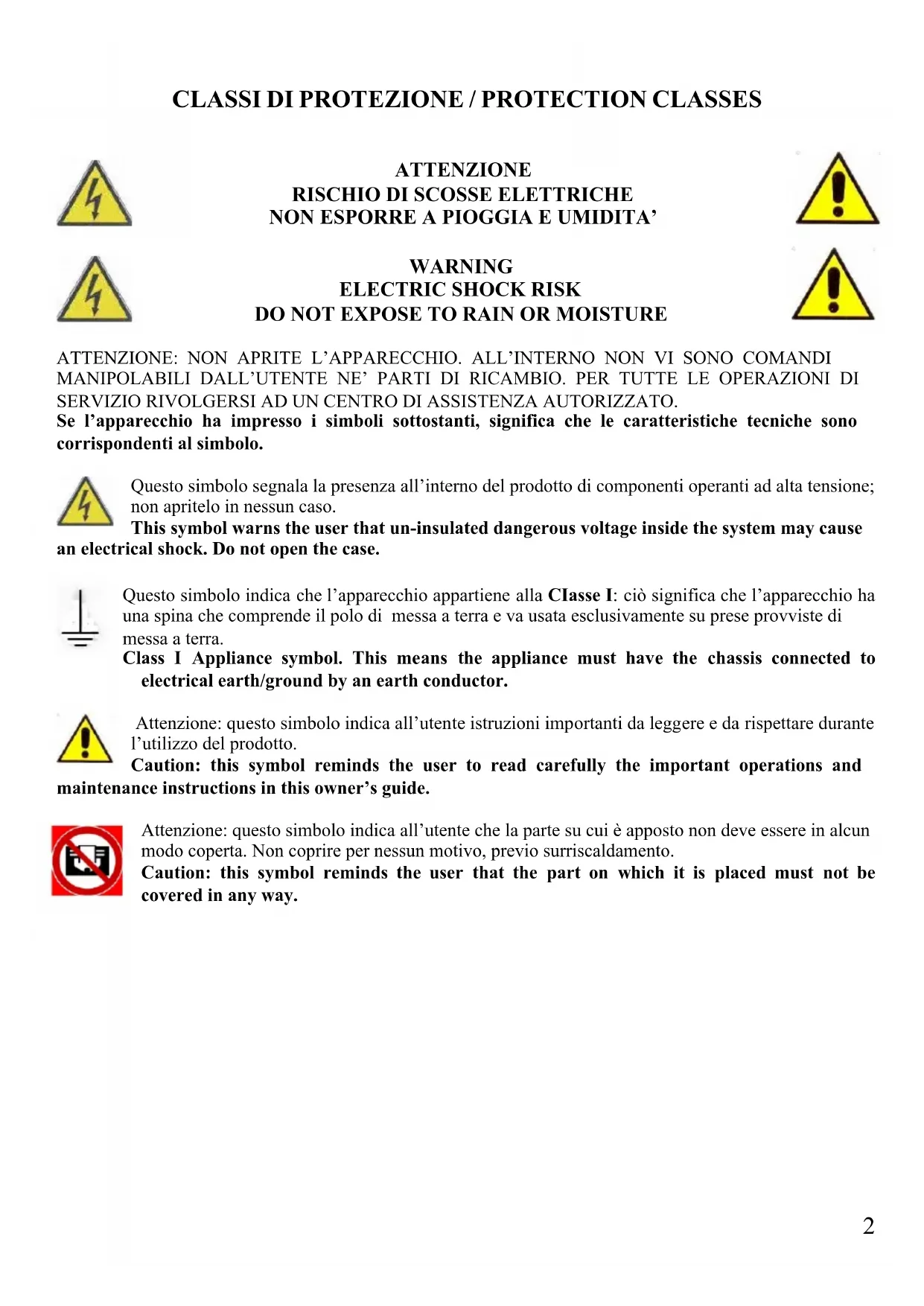 DO NOT EXPOSE TO RAIN OR MOISTURE ATTENZIONE: NON APRITE L’APPARECCHIO. ALL’INTERNO NON VI SONO COMANDI MANIPOLABILI DALL’UTENTE NE’ PARTI DI RICAMBIO. PER TUTTE LE OPERAZIONI DI SERVIZIO RIVOLGERSI AD UN CENTRO DI ASSISTENZA AUTORIZZATO. Se l’apparecchio ha impresso i simboli sottostanti, significa che le caratteristiche tecniche sono corrispondenti al simbolo. Questo simbolo segnala la presenza all’interno del prodotto di componenti operanti ad alta tensione; non apritelo in nessun caso. This symbol warns the user that un-insulated dangerous voltage inside the system may cause an electrical shock. Do not open the case. Questo simbolo indica che l’apparecchio appartiene alla CIasse I: ciò significa che l’apparecchio ha una spina che comprende il polo di messa a terra e va usata esclusivamente su prese provviste di messa a terra. Class I Appliance symbol. This means the appliance must have the chassis connected to electrical earth/ground by an earth conductor. Attenzione: questo simbolo indica all’utente istruzioni importanti da leggere e da rispettare durante l’utilizzo del prodotto. Caution: this symbol reminds the user to read carefully the important operations and maintenance instructions in this owner’s guide. Attenzione: questo simbolo indica all’utente che la parte su cui è apposto non deve essere in alcun modo coperta. Non coprire per nessun motivo, previo surriscaldamento. Caution: this symbol reminds the user that the part on which it is placed must not be covered in any way.3