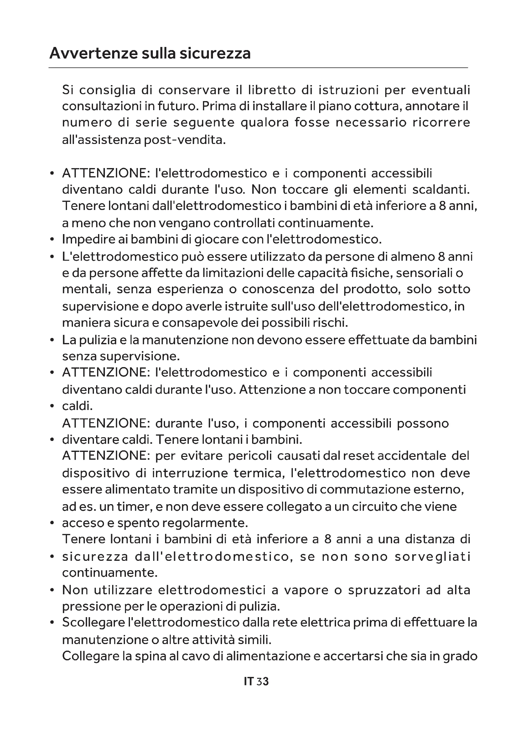 L'ENVIRONNEMENT Dans la mesure du possible, utilisez un couvercle pour couvrir la casserole. Réglez la flamme de sorte que celle-ci ne dépasse pas le fond de la casserole. FR 32IT 33 Si consiglia di conservare il libretto di istruzioni per eventuali consultazioni in futuro. Prima di installare il piano cottura, annotare il numero di serie seguente qualora fosse necessario ricorrere all'assistenza post-vendita. ATTENZIONE: l'elettrodomestico e i componenti accessibili diventano caldi durante l'uso. Non toccare gli elementi scaldanti. Tenere lontani dall'elettrodomestico i bambini di età inferiore a 8 anni, a meno che non vengano controllati continuamente. Impedire ai bambini di giocare con l'elettrodomestico. La pulizia e la manutenzione non devono essere effettuate da bambini senza supervisione. ATTENZIONE: l'elettrodomestico e i componenti accessibili diventano caldi durante l'uso. Attenzione a non toccare componenti caldi. ATTENZIONE: per evitare pericoli causati dal reset accidentale del dispositivo di interruzione termica, l'elettrodomestico non deve essere alimentato tramite un dispositivo di commutazione esterno, ad es. un timer, e non deve essere collegato a un circuito che viene acceso e spento regolarmente. Tenere lontani i bambini di età inferiore a 8 anni a una distanza di sicurezza dall'elettrodomestico, se non sono sorvegliati continuamente. ATTENZIONE: durante l'uso, i componenti accessibili possono diventare caldi. Tenere lontani i bambini. L'elettrodomestico può essere utilizzato da persone di almeno 8 anni e da persone affette da limitazioni delle capacità fisiche, sensoriali o mentali, senza esperienza o conoscenza del prodotto, solo sotto supervisione e dopo averle istruite sull'uso dell'elettrodomestico, in maniera sicura e consapevole dei possibili rischi. Collegare la spina al cavo di alimentazione e accertarsi che sia in grado Non utilizzare elettrodomestici a vapore o spruzzatori ad alta pressione per le operazioni di pulizia. Scollegare l'elettrodomestico dalla rete elettrica prima di effettuare la manutenzione o altre attività simili. Avvertenze sulla sicurezza