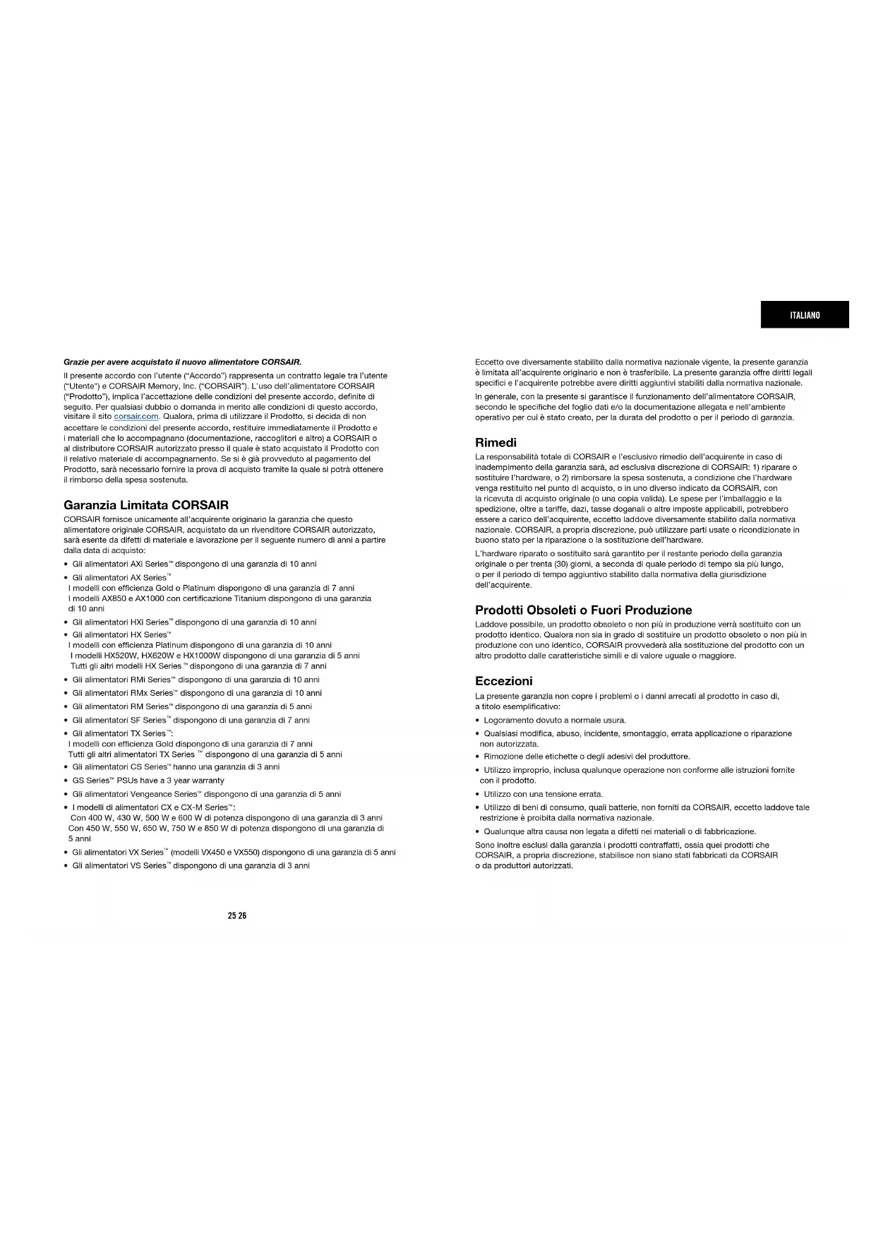 komen daarmee onmiddellijk alle garanties te vervallen.25 26 ITALIANO Grazie per avere acquistato il nuovo alimentatore CORSAIR. Il presente accordo con l’utente (“Accordo”) rappresenta un contratto legale tra l’utente (“Utente") e CORSAIR Memory, Inc. (“CORSAIR”). L’uso dell’alimentatore CORSAIR (“Prodotto”), implica l’accettazione delle condizioni del presente accordo, definite di seguito. Per qualsiasi dubbio o domanda in merito alle condizioni di questo accordo, visitare il sito corsair.com. Qualora, prima di utilizzare il Prodotto, si decida di non accettare le condizioni del presente accordo, restituire immediatamente il Prodotto e i materiali che lo accompagnano (documentazione, raccoglitori e altro) a CORSAIR o al distributore CORSAIR autorizzato presso il quale è stato acquistato il Prodotto con il relativo materiale di accompagnamento. Se si è già provveduto al pagamento del Prodotto, sarà necessario fornire la prova di acquisto tramite la quale si potrà ottenere il rimborso della spesa sostenuta. Garanzia Limitata CORSAIR CORSAIR fornisce unicamente all’acquirente originario la garanzia che questo alimentatore originale CORSAIR, acquistato da un rivenditore CORSAIR autorizzato, sarà esente da difetti di materiale e lavorazione per il seguente numero di anni a partire dalla data di acquisto: