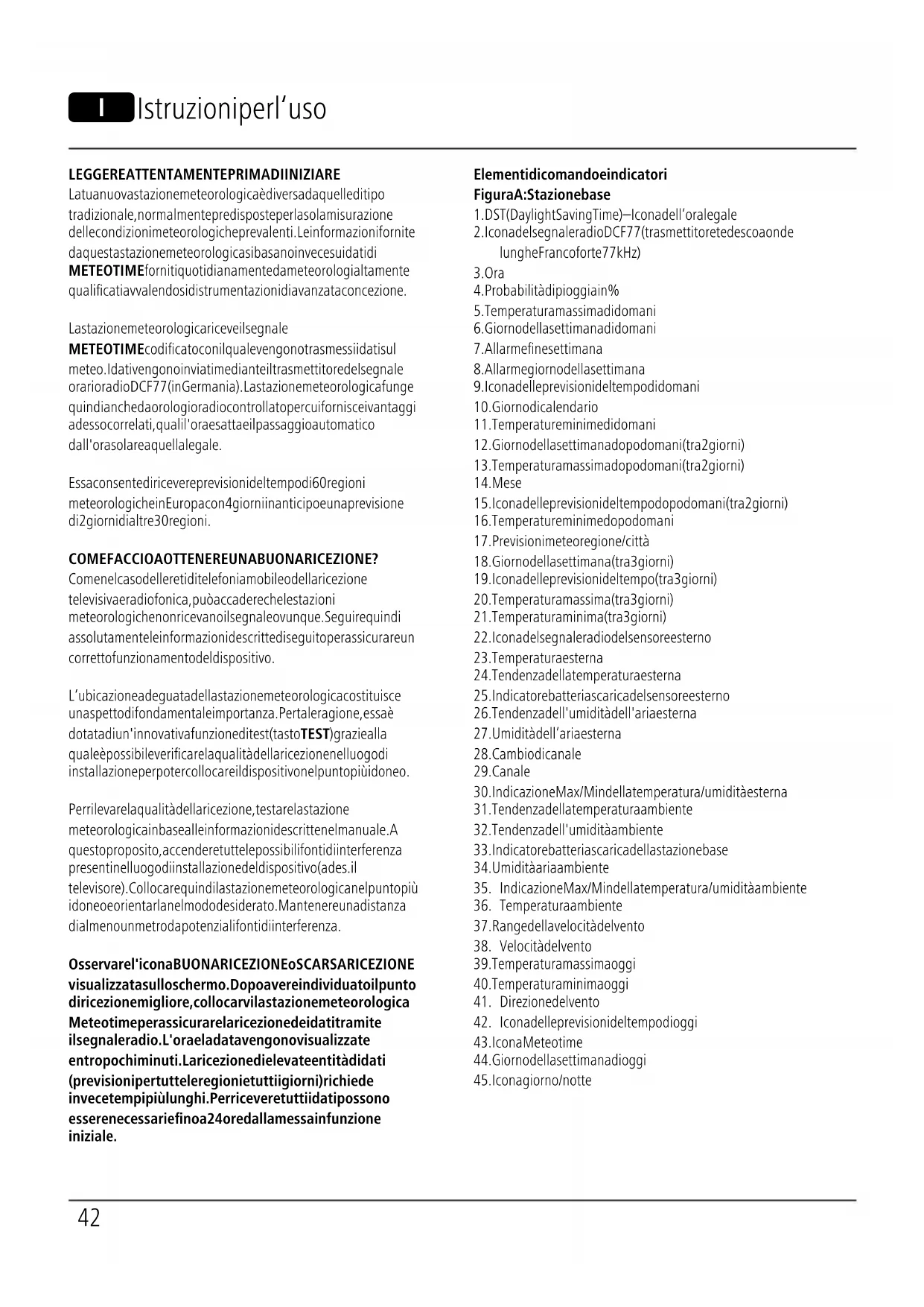 La tua nuova stazione meteorologica è diversa da quelle di tipo tradizionale, normalmente predisposte per la sola misurazione delle condizioni meteorologiche prevalenti. Le informazioni fornite da questa stazione meteorologica si basano invece sui dati di METEOTIME forniti quotidianamente da meteorologi altamente qualicati avvalendosi di strumentazioni di avanzata concezione. La stazione meteorologica riceve il segnale METEOTIME codicato con il quale vengono trasmessi i dati sul meteo. I dati vengono inviati mediante il trasmettitore del segnale orario radio DCF77 (in Germania). La stazione meteorologica funge quindi anche da orologio radiocontrollato per cui fornisce i vantaggi ad esso correlati, quali l'ora esatta e il passaggio automatico dall'ora solare a quella legale. Essa consente di ricevere previsioni del tempo di 60 regioni meteorologiche in Europa con 4 giorni in anticipo e una previsione di 2 giorni di altre 30 regioni. COME FACCIO A OTTENERE UNA BUONA RICEZIONE? Come nel caso delle reti di telefonia mobile o della ricezione televisiva e radiofonica, può accadere che le stazioni meteorologiche non ricevano il segnale ovunque. Seguire quindi assolutamente le informazioni descritte di seguito per assicurare un corretto funzionamento del dispositivo. L’ubicazione adeguata della stazione meteorologica costituisce un aspetto di fondamentale importanza. Per tale ragione, essa è dotata di un'innovativa funzione di test (tasto TEST) grazie alla quale è possibile vericare la qualità della ricezione nel luogo di installazione per poter collocare il dispositivo nel punto più idoneo. Per rilevare la qualità della ricezione, testare la stazione meteorologica in base alle informazioni descritte nel manuale. A questo proposito, accendere tutte le possibili fonti di interferenza presenti nel luogo di installazione del dispositivo (ad es. il televisore). Collocare quindi la stazione meteorologica nel punto più idoneo e orientarla nel modo desiderato. Mantenere una distanza di almeno un metro da potenziali fonti di interferenza. Osservare l'icona BUONA RICEZIONE o SCARSA RICEZIONE visualizzata sullo schermo. Dopo avere individuato il punto di ricezione migliore, collocarvi la stazione meteorologica Meteotime per assicurare la ricezione dei dati tramite il segnale radio. L'ora e la data vengono visualizzate entro pochi minuti. La ricezione di elevate entità di dati (previsioni per tutte le regioni e tutti i giorni) richiede invece tempi più lunghi. Per ricevere tutti i dati possono essere necessarie no a 24 ore dalla messa in funzione iniziale. Elementi di comando e indicatori Figura A: Stazione base