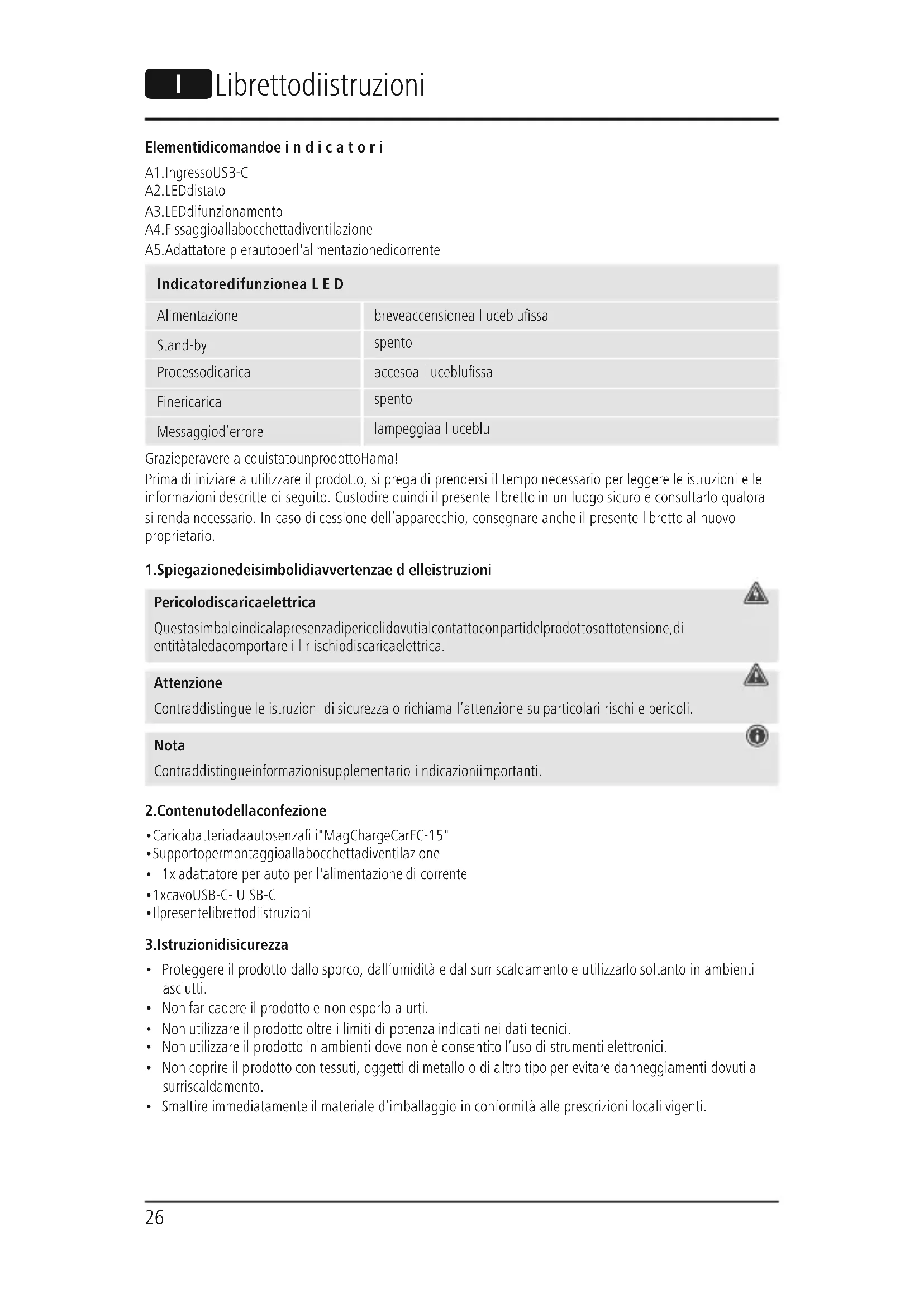 Hama GmbH &CoKG verklaart hierb dat dit toestel [00187268] zich in overeenstemming met de essentiële eisen en aan de overige relevante bepalingen van de Richtln2014/53/EU bevindt. De conformiteitsverklaring overeenkomstig de desbetreffende Richtlnvindt uonder: www.hama.com ->00187268-> Downloads. Frequentieband(en) 112.600KHz –152.600 KHz Maximaal radiofrequent vermogen -14.69dBµA/m bij 10 m26 I Libretto di istruzioni Elementi di comando eindicatori A1. Ingresso USB-C A2. LED di stato A3. LED di funzionamento A4. Fissaggio alla bocchetta di ventilazione A5. Adattatoreper auto per l'alimentazione di corrente Indicatore di funzione aLED Alimentazione breve accensione aluce blu ssa Stand-by spento Processo di carica acceso aluce blu ssa Fine ricarica spento Messaggio d’errore lampeggia aluce blu Grazie per avereacquistato un prodotto Hama! Prima di iniziareautilizzareilprodotto, si prega di prendersi il tempo necessario per leggereleistruzioni ele informazioni descritte di seguito. Custodirequindi il presente libretto in un luogo sicuroeconsultarlo qualora si renda necessario. In caso di cessione dell’apparecchio, consegnareanche il presente libretto al nuovo proprietario.