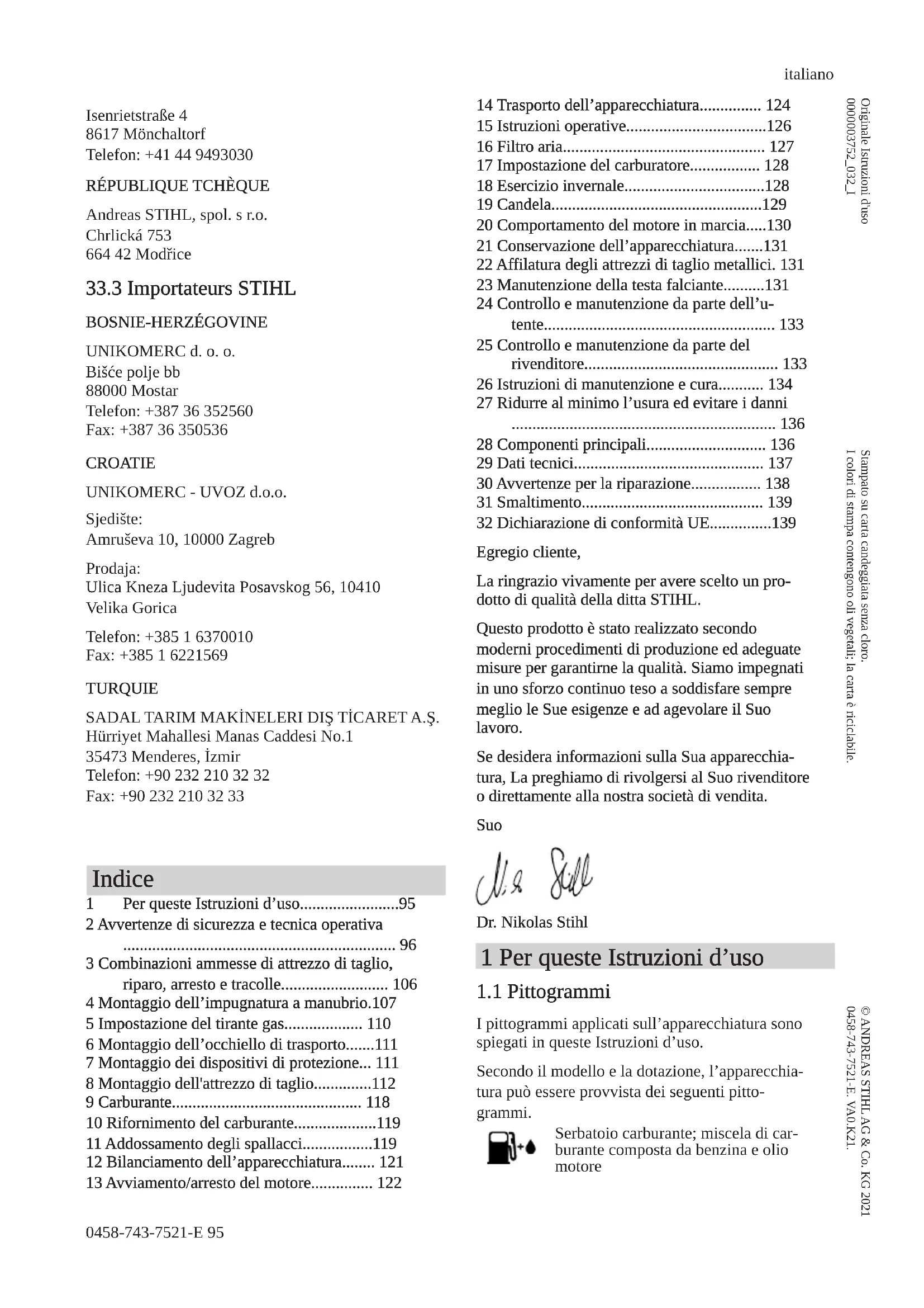 - 32 Dichiarazione di conformità UE Egregio cliente, La ringrazio vivamente per avere scelto un pro‐ dotto di qualità della ditta STIHL. Questo prodotto è stato realizzato secondo moderni procedimenti di produzione ed adeguate misure per garantirne la qualità. Siamo impegnati in uno sforzo continuo teso a soddisfare sempre meglio le Sue esigenze e ad agevolare il Suo lavoro. Se desidera informazioni sulla Sua apparecchia‐ tura, La preghiamo di rivolgersi al Suo rivenditore o direttamente alla nostra società di vendita. Suo Dr. Nikolas Stihl 1 Per queste Istruzioni d’uso p. 139