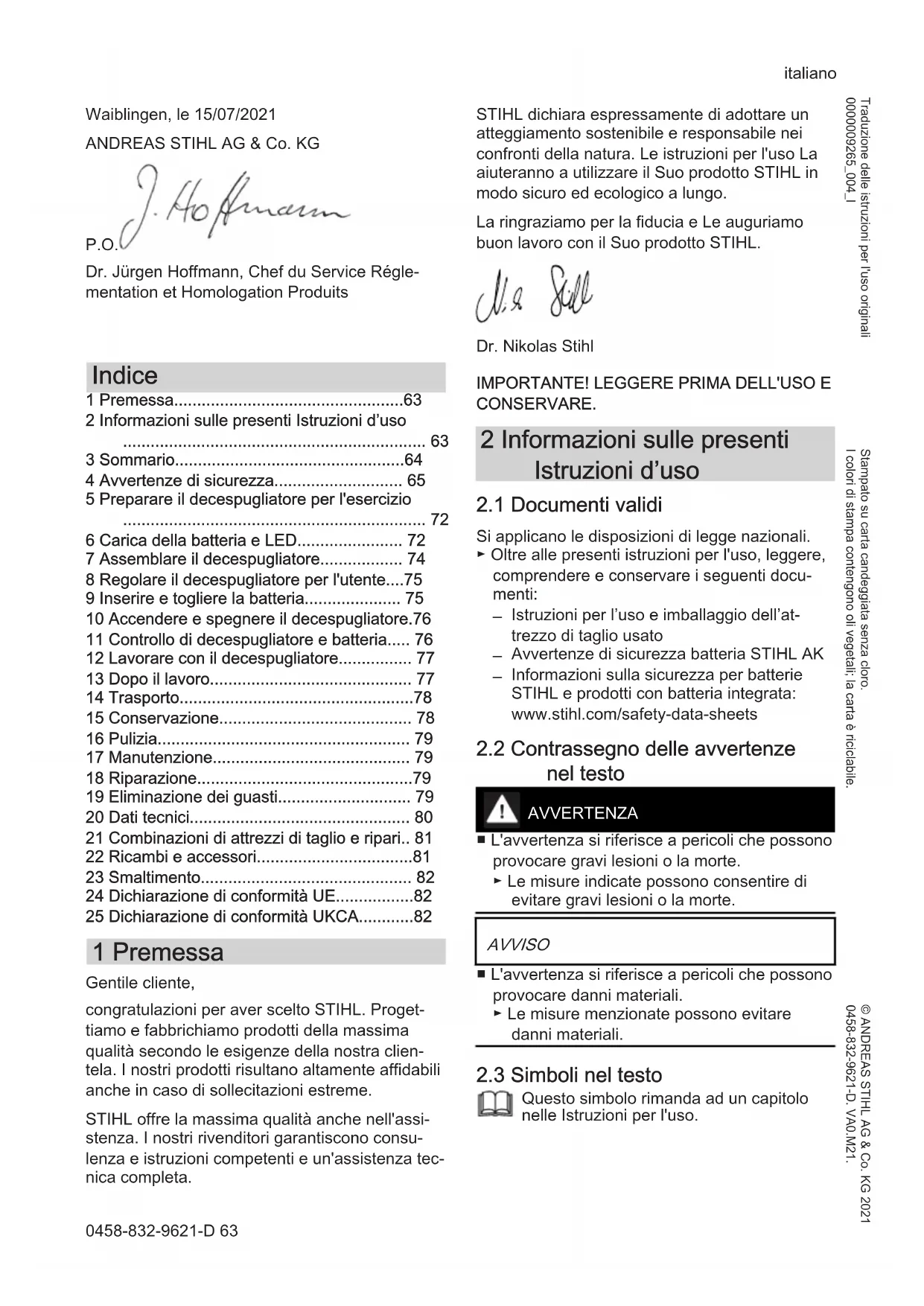 - 25 Dichiarazione di conformità UKCA 1 Premessa Gentile cliente, congratulazioni per aver scelto STIHL. Proget‐ tiamo e fabbrichiamo prodotti della massima qualità secondo le esigenze della nostra clien‐ tela. I nostri prodotti risultano altamente affidabili anche in caso di sollecitazioni estreme. STIHL offre la massima qualità anche nell'assi‐ stenza. I nostri rivenditori garantiscono consu‐ lenza e istruzioni competenti e un'assistenza tec‐ nica completa. STIHL dichiara espressamente di adottare un atteggiamento sostenibile e responsabile nei confronti della natura. Le istruzioni per l'uso La aiuteranno a utilizzare il Suo prodotto STIHL in modo sicuro ed ecologico a lungo. La ringraziamo per la fiducia e Le auguriamo buon lavoro con il Suo prodotto STIHL. Dr. Nikolas Stihl p. 82