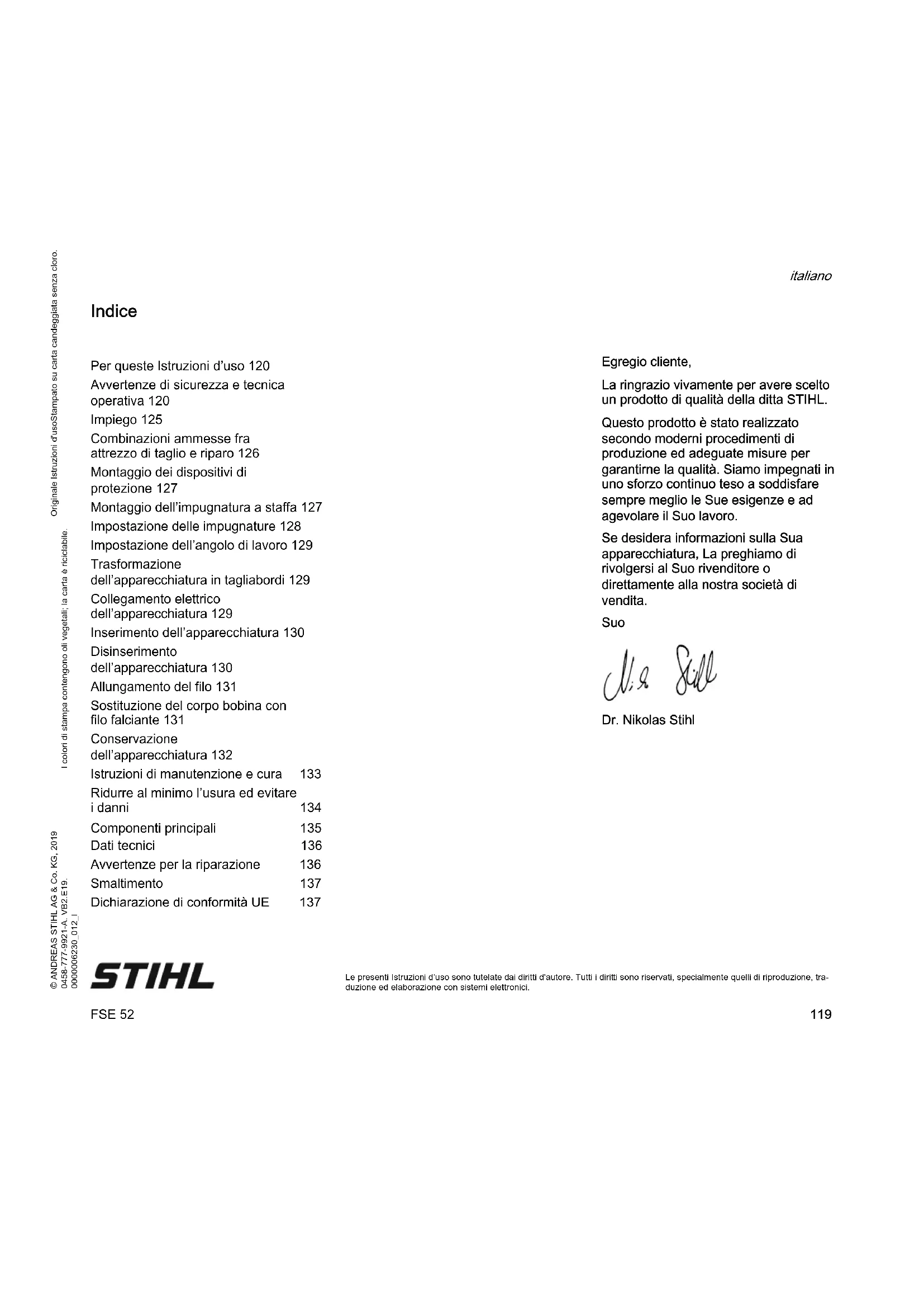 Le presenti Istruzioni d’uso sono tutelate dai diritti d'autore. Tutti i diritti sono riservati, specialmente quelli di riproduzione, tra- duzione ed elaborazione con sistemi elettronici. Indice Egregio cliente, La ringrazio vivamente per avere scelto un prodotto di qualità della ditta STIHL. Questo prodotto è stato realizzato secondo moderni procedimenti di produzione ed adeguate misure per garantirne la qualità. Siamo impegnati in uno sforzo continuo teso a soddisfare sempre meglio le Sue esigenze e ad agevolare il Suo lavoro. Se desidera informazioni sulla Sua apparecchiatura, La preghiamo di rivolgersi al Suo rivenditore o direttamente alla nostra società di vendita. Suo Dr. Nikolas Stihl Per queste Istruzioni d’uso 120 Avvertenze di sicurezza e tecnica operativa 120 Impiego 125 Combinazioni ammesse fra attrezzo di taglio e riparo 126 Montaggio dei dispositivi di protezione 127 Montaggio dell’impugnatura a staffa 127 Impostazione delle impugnature 128 Impostazione dell’angolo di lavoro 129 Trasformazione dell’apparecchiatura in tagliabordi 129 Collegamento elettrico dell’apparecchiatura 129 Inserimento dell’apparecchiatura 130 Disinserimento dell’apparecchiatura 130 Allungamento del filo 131 Sostituzione del corpo bobina con filo falciante 131 Conservazione dell’apparecchiatura 132 Istruzioni di manutenzione e cura 133 Ridurre al minimo l’usura ed evitare i danni 134 Componenti principali 135 Dati tecnici 136 Avvertenze per la riparazione 136 Smaltimento 137 Dichiarazione di conformità UE 137FSE 52 italiano
