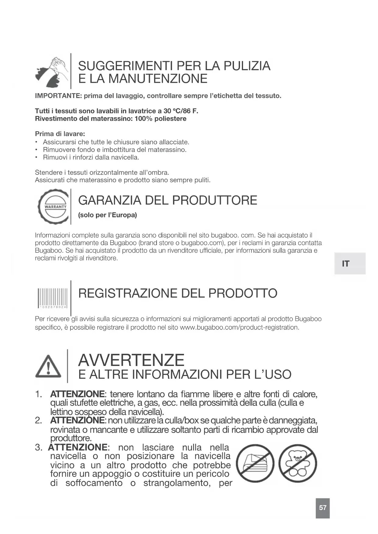 Per ricevere gli avvisi sulla sicurezza o informazioni sui miglioramenti apportati al prodotto Bugaboo specico, è possibile registrare il prodotto nel sito www.bugaboo.com/product-registration. AVVERTENZE