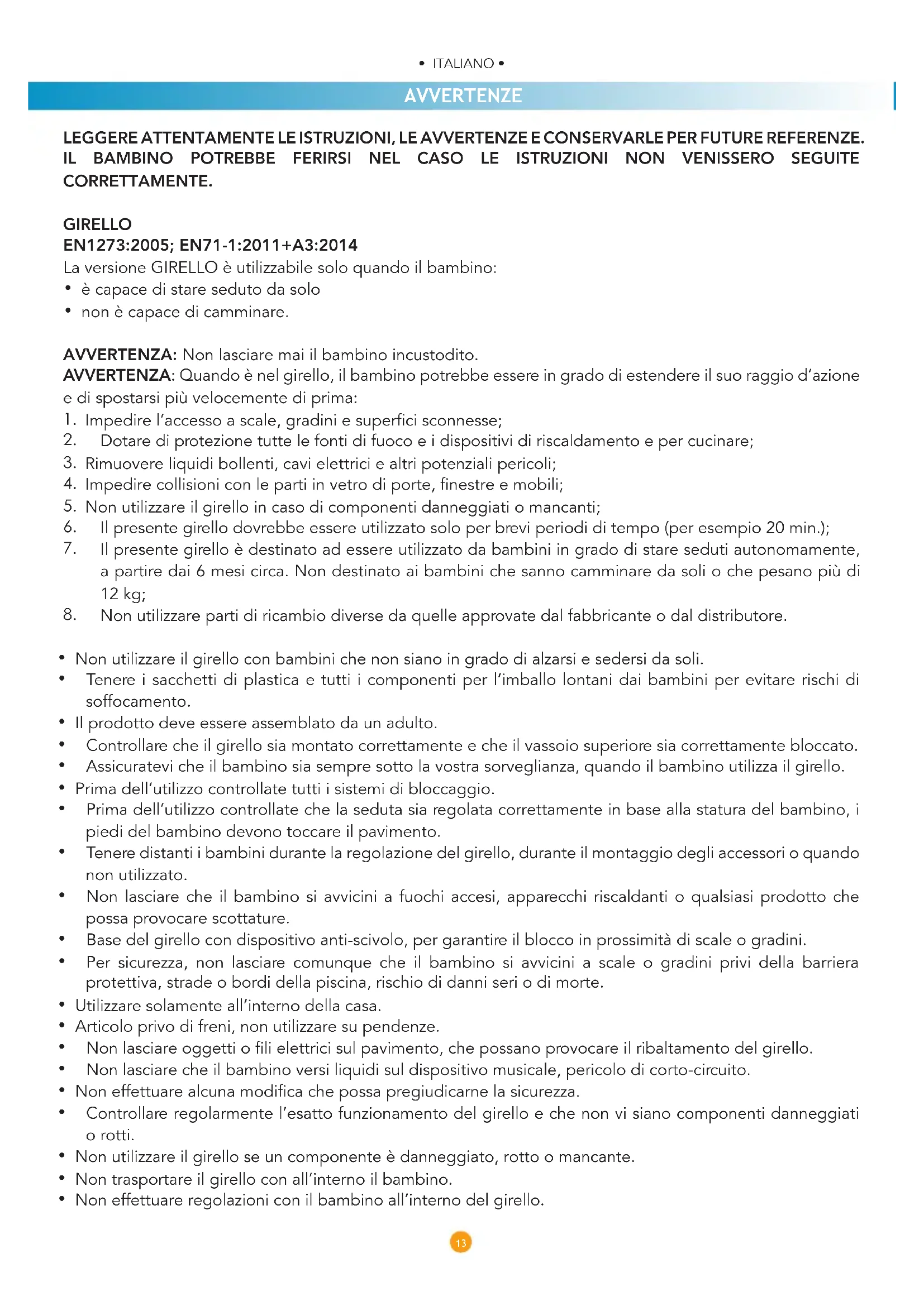 - ITALIANO • AVVERTENZE LEGGERE ATTENTAMENTE LE ISTRUZIONI, LE AVVERTENZE E CONSERVARLE PER FUTURE REFERENZE. IL BAMBINO POTREBBE FERIRSI NEL CASO LE ISTRUZIONI NON VENISSERO SEGUITE CORRETTAMENTE. GIRELLO EN1273:2005; EN71-1:2011+A3:2014 La versione GIRELLO è utilizzabile solo quando il bambino: