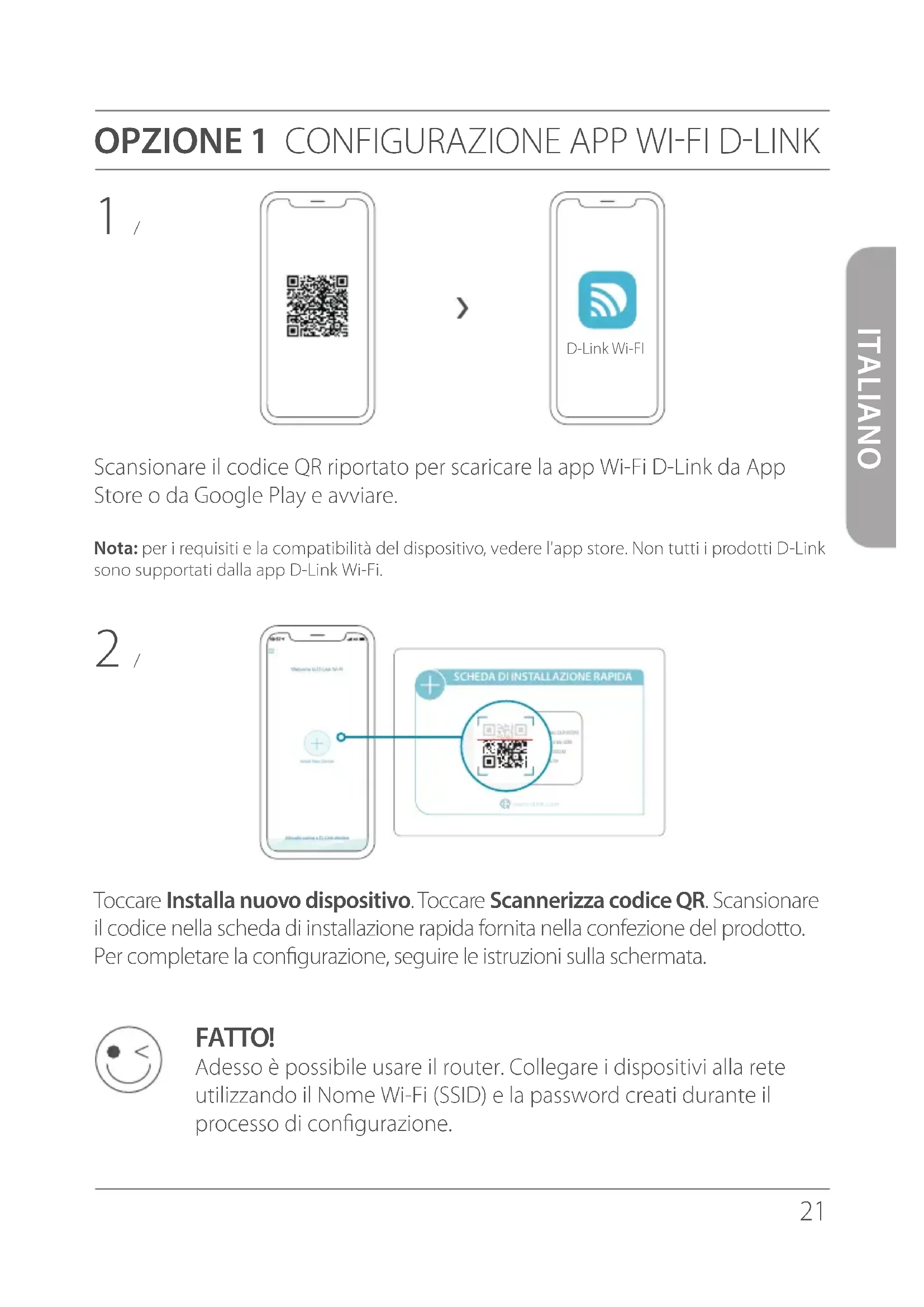 www.dlink.com Nome modello: DISPOSITIVO Nome Wi-Fi: d-link-XXXX Password: XXXXXXXX S/N: 123456789 FATTO! Adesso è possibile usare il router. Collegare i dispositivi alla rete utilizzando il Nome Wi-Fi (SSID) e la password creati durante il processo di configurazione. D-Link Wi-FI22 ITALIANO
