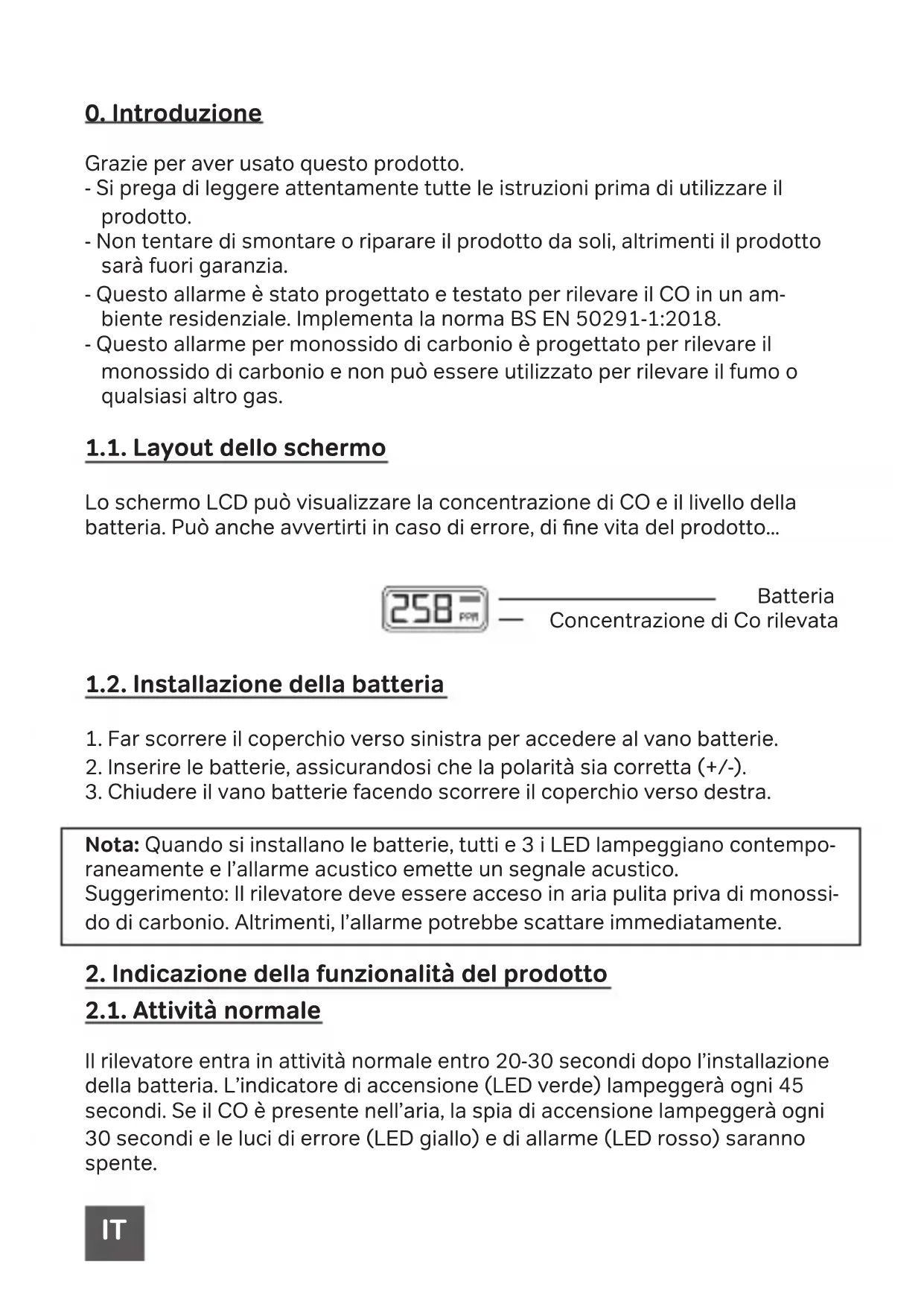 - Conteúdo da caixa: Detector de Co + manual + kit de xação Support www.chacon.com/support PT0. Introduzione Grazie per aver usato questo prodotto. - Si prega di leggere attentamente tutte le istruzioni prima di utilizzare il prodotto. - Non tentare di smontare o riparare il prodotto da soli, altrimenti il prodotto sarà fuori garanzia. - Questo allarme è stato progettato e testato per rilevare il CO in un am- biente residenziale. Implementa la norma BS EN 50291-1:2018. - Questo allarme per monossido di carbonio è progettato per rilevare il monossido di carbonio e non può essere utilizzato per rilevare il fumo o qualsiasi altro gas. 1.1. Layout dello schermo Lo schermo LCD può visualizzare la concentrazione di CO e il livello della batteria. Può anche avvertirti in caso di errore, di ne vita del prodotto... 1.2. Installazione della batteria