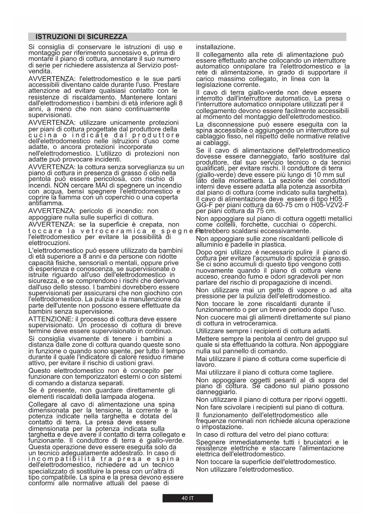 INSTALLARE UN ELETTRODOMESTICO PUÒ ESSERE UN'OPERAZIONE COMPLICATA CHE, SE NON ESEGUITA CORRETTAMENTE, PUÒ COMPROMETTERE SERIAMENTE LA SICUREZZA DELL'UTENTE. È PER QUESTA RAGIONE CHE L'OPERAZIONE DEV'ESSERE CONDOTTA DA PERSONALE PROFESSIONALMENTE QUALIFICATO CHE TENGA PRESENTE LE NORME VIGENTI. NEL CASO IN CUI QUESTO AVVISO VENGA IGNORATO E L'INSTALLAZIONE VENGA ESEGUITA DA PERSONALE NON QUALIFICATO, IL PRODUTTORE DECLINA OGNI RESPONSABILITÀ PER OGNI PROBLEMA TECNICO DEL PRODOTTO SIA IN CASO DI DANNI A COSE O PERSONE SIA IN ASSENZA DI ESSI. 2.1. CONNESSIONE ELETTRICA Controllare i dati sulla placca segnaletica, situata sotto l'unità, per assicurarsi che il collegamento elettrico sia corretto. Prima della connessione, controllare l'impianto di messa a terra. Per legge, quest'apparecchio deve avere la messa a terra. Se questa operazione non viene eseguita, il produttore non sarà responsabile di eventuali danni occorsi a persone o proprietà. Se non è già applicata una spina, applicarne una appropriata come indicato sulla placca segnaletica. Il cavo di messa a terra è di color verde/giallo. La spina deve essere posizionata in modo tale che sia sempre accessibile. Qualora il piano cottura sia connesso direttamente all'alimentazione principale, bisognerà predisporre anche un salvavita. Se il cavo di alimentazione è danneggiato dovrà essere sostituito da personale qualificato in modo da prevenire qualsiasi potenziale rischio. Il cavo di messa a terra (di color verde/giallo) deve essere più lungo di almeno 10 mm rispetto ai cavi neutro e fase. La sezione del cavo usato deve essere delle giuste dimensioni in base all'assorbimento dell'apparecchio. Si prega di controllare la placca segnaletica per i dettagli riguardanti la potenza dell'aparecchio e assicurare che il cavo di connessione sia dei tipi 3x0.75 mm² H05 GG-F per piani cottura da 60-75 cm o H05- V2V2-F per piani cottura da 75 cm. FASE TERRA NEUTRA