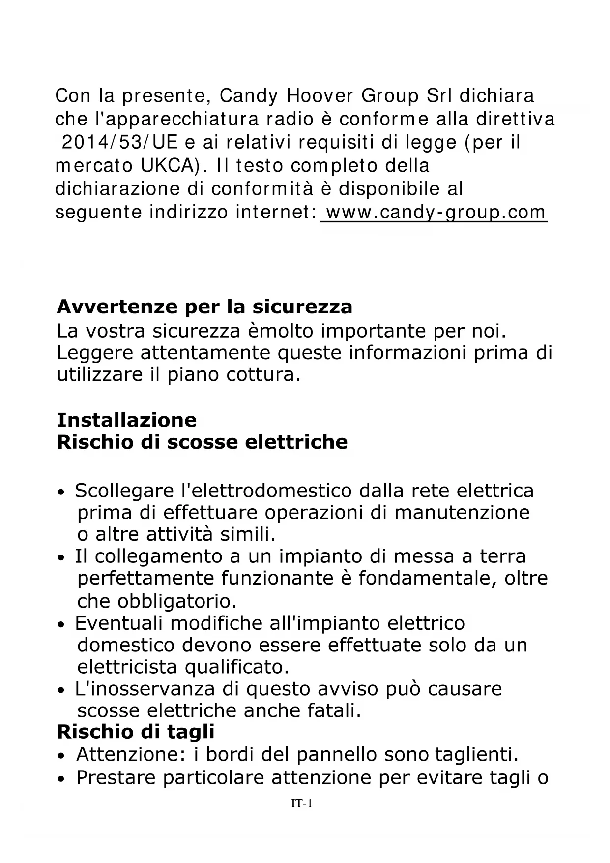 - Prestare particolare attenzione per evitare tagli o Avvertenze per la sicurezza La vostra sicurezza èmolto importante per noi. Leggere attentamente queste informazioni prima di utilizzare il piano cottura. Installazione Rischio di scosse elettriche Con la presente, Candy Hoover Group Srl dichiara che l'apparecchiatura radio è conforme alla direttiva 2014/53/UE e ai relativi requisiti di legge (per il mercato UKCA). Il testo completo della dichiarazione di conformità è disponibile al seguente indirizzo internet: www.candy-group.comIT-2
