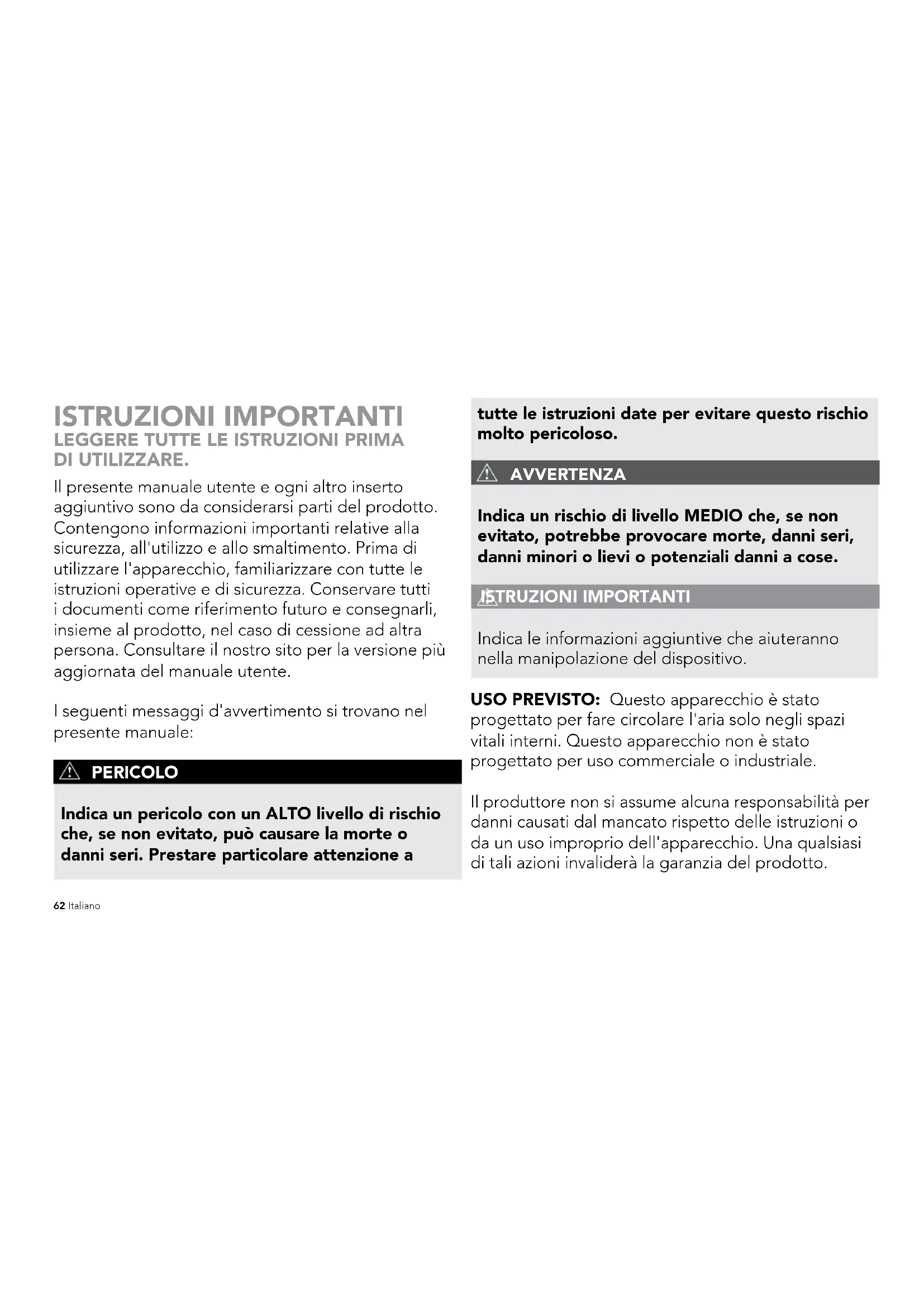 - Garanzia Italiano Il presente manuale utente e ogni altro inserto aggiuntivo sono da considerarsi parti del prodotto. Contengono informazioni importanti relative alla sicurezza, all'utilizzo e allo smaltimento. Prima di utilizzare l'apparecchio, familiarizzare con tutte le istruzioni operative e di sicurezza. Conservare tutti i documenti come riferimento futuro e consegnarli, insieme al prodotto, nel caso di cessione ad altra persona. Consultare il nostro sito per la versione più aggiornata del manuale utente. I seguenti messaggi d'avvertimento si trovano nel presente manuale: PERICOLO Indica un pericolo con un ALTO livello di rischio che, se non evitato, può causare la morte o danni seri. Prestare particolare attenzione a tutte le istruzioni date per evitare questo rischio molto pericoloso. AVVERTENZA Indica un rischio di livello MEDIO che, se non evitato, potrebbe provocare morte, danni seri, danni minori o lievi o potenziali danni acose. ISTRUZIONI IMPORTANTI Indica le informazioni aggiuntive che aiuteranno nella manipolazione del dispositivo. USO PREVISTO: Questo apparecchio è stato progettato per fare circolare l'aria solo negli spazi vitali interni. Questo apparecchio non è stato progettato per uso commerciale o industriale. Il produttore non si assume alcuna responsabilità per danni causati dal mancato rispetto delle istruzioni o da un uso improprio dell'apparecchio. Una qualsiasi di tali azioni invaliderà la garanzia del prodotto. ISTRUZIONI IMPORTANTI p. 7462
