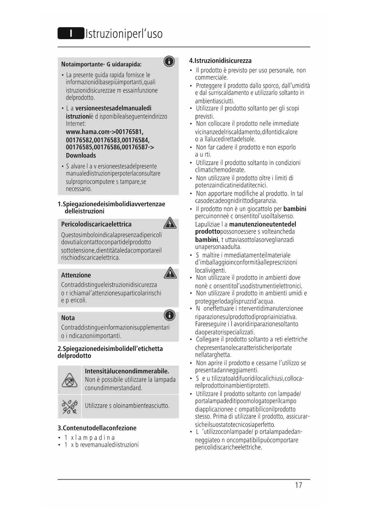 Scarica le istruzioni per il tuo Illuminazione in formato PDF gratuitamente! Trova il tuo manuale 00176583 - HAMA e riprendi in mano il tuo dispositivo elettronico. In questa pagina sono pubblicati tutti i documenti necessari per l'utilizzo del tuo dispositivo. 00176583 del marchio HAMA.