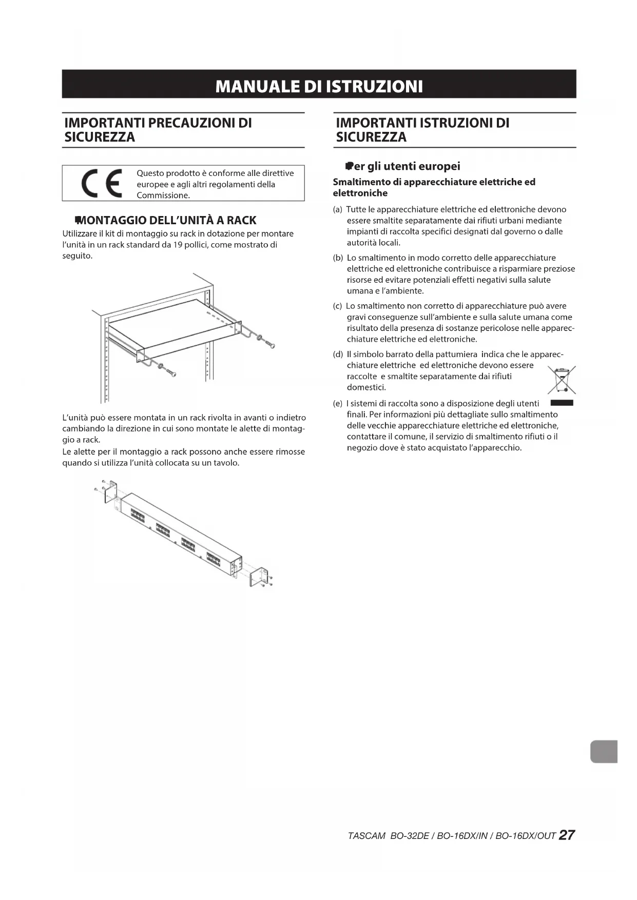Per gli utenti europei Smaltimento di apparecchiature elettriche ed elettroniche (a) Tutte le apparecchiature elettriche ed elettroniche devono essere smaltite separatamente dai rifiuti urbani mediante impianti di raccolta specifici designati dal governo o dalle autorità locali. (b) Lo smaltimento in modo corretto delle apparecchiature elettriche ed elettroniche contribuisce a risparmiare preziose risorse ed evitare potenziali effetti negativi sulla salute umana e l’ambiente. (c) Lo smaltimento non corretto di apparecchiature può avere gravi conseguenze sull’ambiente e sulla salute umana come risultato della presenza di sostanze pericolose nelle apparec- chiature elettriche ed elettroniche. (d) Il simbolo barrato della pattumiera indica che le apparec- chiature elettriche ed elettroniche devono essere raccolte e smaltite separatamente dai rifiuti domestici. (e) I sistemi di raccolta sono a disposizione degli utenti finali. Per informazioni più dettagliate sullo smaltimento delle vecchie apparecchiature elettriche ed elettroniche, contattare il comune, il servizio di smaltimento rifiuti o il negozio dove è stato acquistato l’apparecchio.28 TASCAM BO-32DE / BO-16DX/IN / BO-16DX/OUT Indice dei contenuti