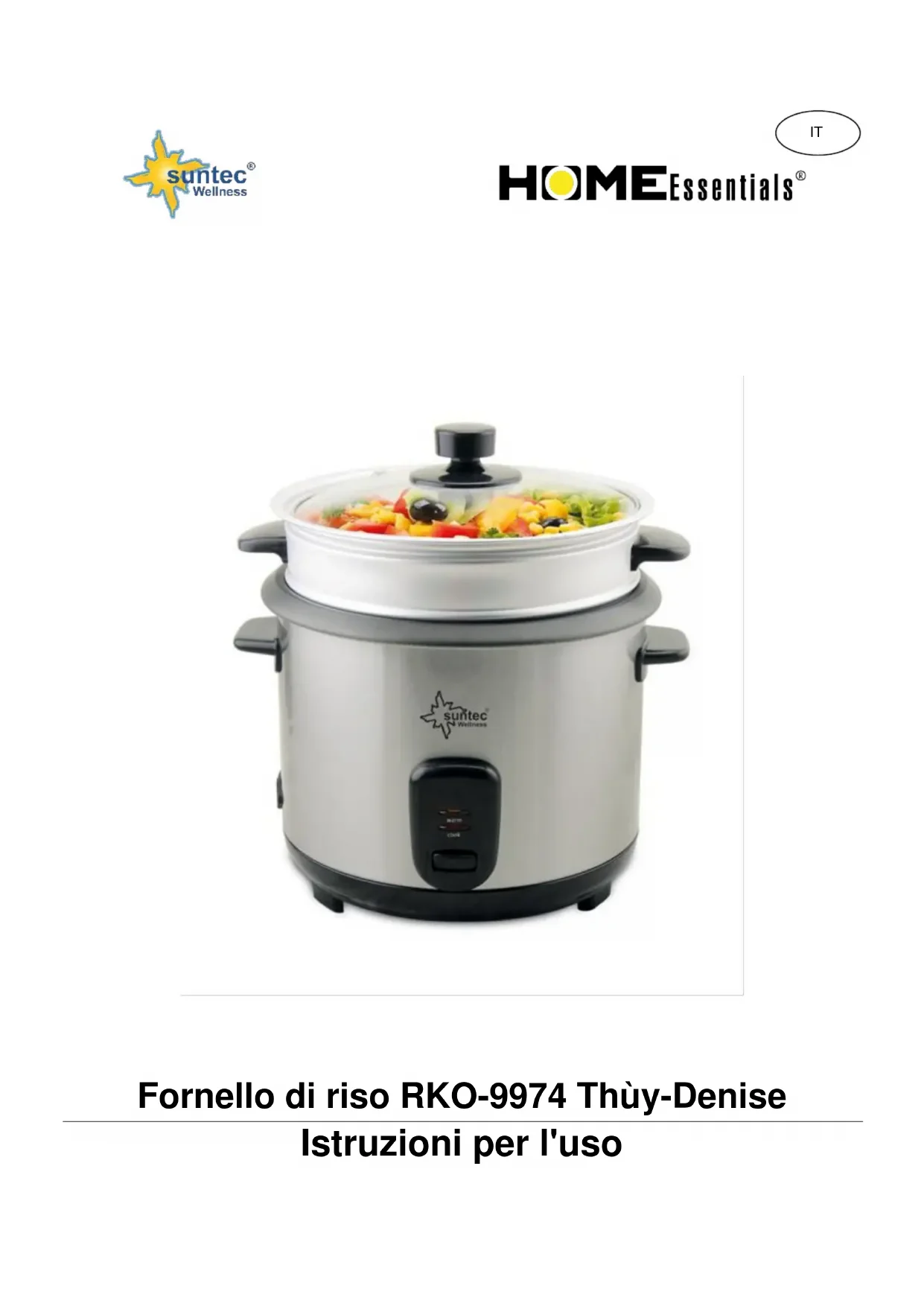 - The dealer or repair service can perform the repair after the expiration of warranty against charge. Note concerning protection of environment This product must not be disposed of via normal household waste after its service life, but must be taken to a collection station for the recycling of electrical and electronic devices. The symbol on the product, the operating instructions or the packaging indicates such disposal procedures. The materials are recyclable in accordance with their respective symbols. By means of re-use, material recycling or any other form of recycling old appliances you are making an important contribution to the protection of our environment. Please ask your local council where your nearest disposal station is located. As part of our extended producer responsibility, this product is indicated in accordance to the European Directive 2012/19/EU on Waste Electrical and Electronic Equipment (WEEE). The aim is to avoid, reduce, and environmentally friendly disposal of electronic waste. Please help actively to protect the environment and dispose electronic waste through local collection points. The packaging and this manual can be recycled. EC declaration of conformity The device meets the essential health and safety requirements of the European Union. The EC declaration of conformity is the basis for CE marking this unit. With publication of this manual supersedes all previous their validity. SUNTEC, SUNTEC Wellness, KLIMATRONIC and the Sun-Logo are registered trademarks. © 2021 SUNTEC WELLNESS GMBH Liability is excluded for all printing errors and omissions. © 2021 Suntec Wellness RKO-9974 SUNTEC WELLNESS GMBH / HOLZSTRASSE 2 / 40221 DÜSSELDORF / GERMANYFornello di riso RKO-9974 Thùy-Denise Istruzioni per l'uso ITGrazie per l'acquisto di questo dispositivo del marchio Suntec Wellness. Prima del primo utilizzo, ti preghiamo di leggere attentamente il manuale. Lo mantieni per riferimento e poi lo inoltri al suo nuovo proprietario, se dai l'apparecchio a un'altra persona. Precauzioni di sicurezza Questo apparecchio può essere utilizzato da bambini di almeno 8 anni di età e da persone con ridotte facoltà psichiche, sensoriali o mentali oppure con mancanza di esperienza e/o conoscenza, se vengono controllati o se sono stati istruiti relativamente all’utilizzo sicuro dell’apparecchio e se ne hanno compreso i pericoli correlati. I bambini non devono giocare con questo apparecchio. Le operazioni di manutenzione per la pulizia e l’utilizzo non devono essere condotte da bambini senza la dovuta sorveglianza. I bambini di età inferiore ai 3 anni senza sorveglianza devono non devono toccare il dispositivo. I bambini a partire dai 3 anni e fino agli 8 anni possono accendere e spegnere il dispositivo solo se posizionato o installato correttamente, se rispettano l’utilizzo corretto del dispositivo e comprendono i possibili pericoli derivanti dall’uso dello stesso. I bambini a partire dai 3 anni e inferiori agli 8 non possono collegare il dispositivo alla presa, non possono regolarlo, pulirlo o eseguire lavori di manutenzione.• Assicurarsi che il lettore su una superficie piana. Chiedi. Non è in ambienti umidi o in prossimità di fonti di calore