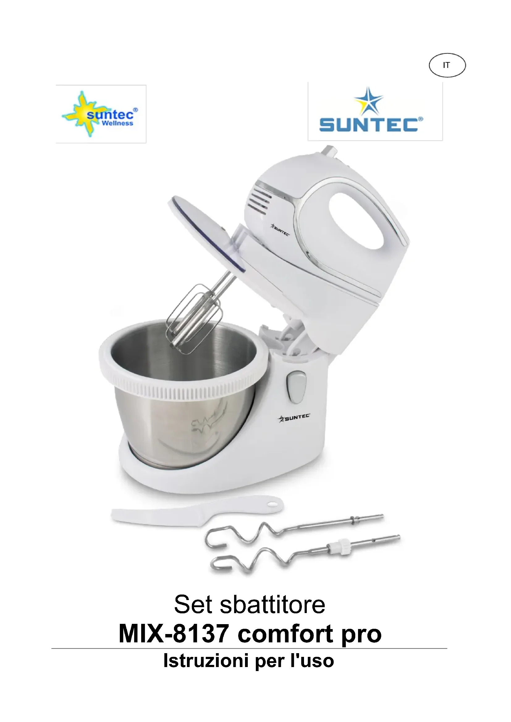 Set sbattitore MIX-8137 comfort pro Istruzioni per l'usoGrazie per l'acquisto di questo dispositivo del marchio Suntec Wellness. Prima del primo utilizzo, ti preghiamo di leggere attentamente il manuale. Lo mantieni per riferimento e poi lo inoltri al suo nuovo proprietario, se dai l'apparecchio a un'altra persona. Precauzioni di sicurezza Questo apparecchio può essere utilizzato da bambini di almeno 8 anni di età e da persone con ridotte facoltà psichiche, sensoriali o mentali oppure con mancanza di esperienza e/o conoscenza, se vengono controllati o se sono stati istruiti relativamente all’utilizzo sicuro dell’apparecchio e se ne hanno compreso i pericoli correlati. I bambini non devono giocare con questo apparecchio. Le operazioni di manutenzione per la pulizia e l’utilizzo non devono essere condotte da bambini senza la dovuta sorveglianza. I bambini di età inferiore ai 3 anni senza sorveglianza devono non devono toccare il dispositivo. I bambini a partire dai 3 anni e fino agli 8 anni possono accendere e spegnere il dispositivo solo se posizionato o installato correttamente, se rispettano l’utilizzo corretto del dispositivo e comprendono i possibili pericoli derivanti dall’uso dello stesso. I bambini a partire dai 3 anni e inferiori agli 8 non possono collegare il dispositivo alla presa, non possono regolarlo, pulirlo o eseguire lavori di manutenzione.