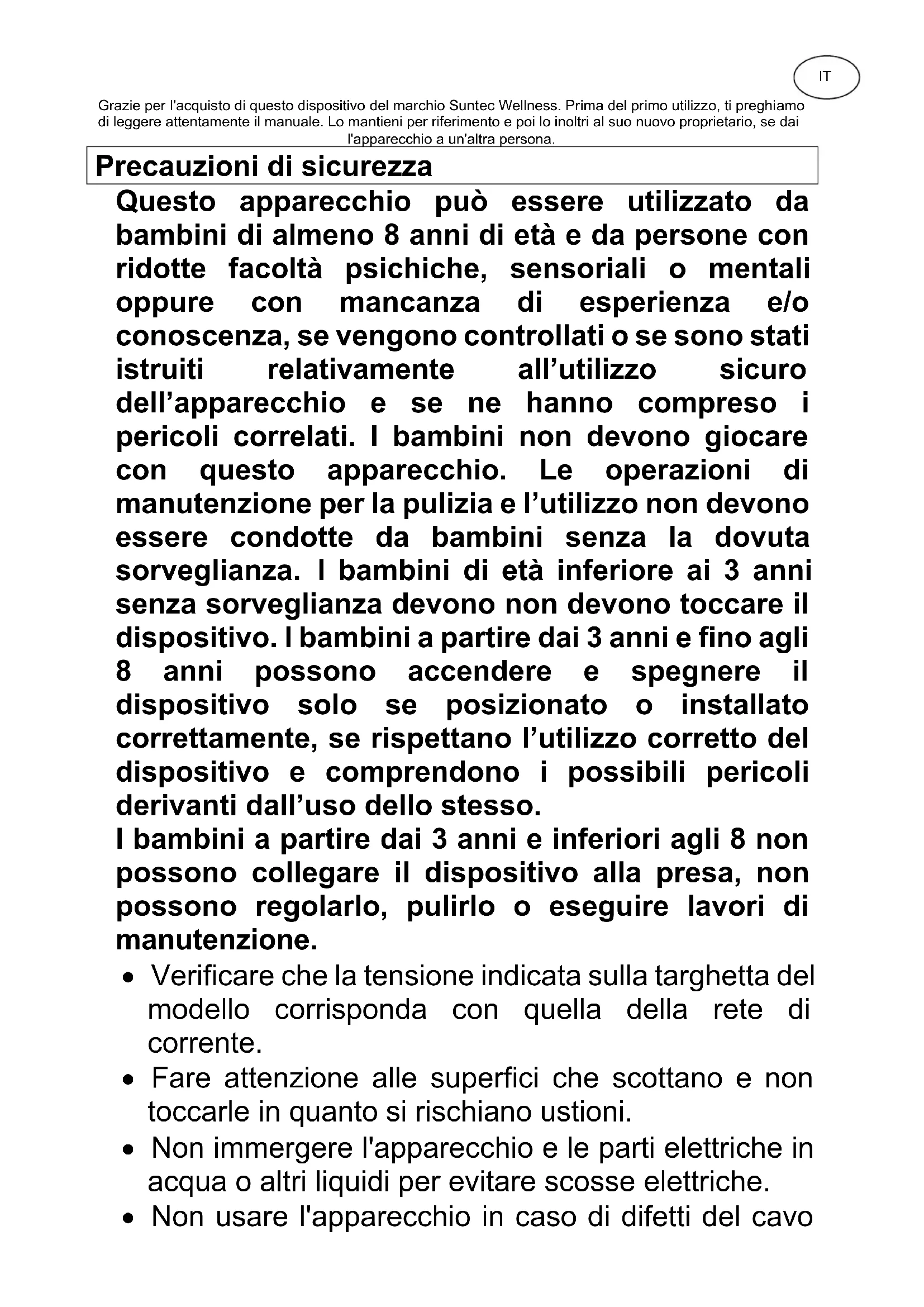 TLW-7024 masterclass SUNTEC WELLNESS GMBH / HOLZSTRASSE 2 / 40 221 DÜSSELDORF / GERMANYIT Grazie per l'acquisto di questo dispositivo del marchio Suntec Wellness. Prima del primo utilizzo, ti preghiamo di leggere attentamente il manuale. Lo mantieni per riferimento e poi lo inoltri al suo nuovo proprietario, se dai l'apparecchio a un'altra persona. Precauzioni di sicurezza Questo apparecchio può essere utilizzato da bambini di almeno 8 anni di età e da persone con ridotte facoltà psichiche, sensoriali o mentali oppure con mancanza di esperienza e/o conoscenza, se vengono controllati o se sono stati istruiti relativamente all’utilizzo sicuro dell’apparecchio e se ne hanno compreso i pericoli correlati. I bambini non devono giocare con questo apparecchio. Le operazioni di manutenzione per la pulizia e l’utilizzo non devono essere condotte da bambini senza la dovuta sorveglianza. I bambini di età inferiore ai 3 anni senza sorveglianza devono non devono toccare il dispositivo. I bambini a partire dai 3 anni e fino agli 8 anni possono accendere e spegnere il dispositivo solo se posizionato o installato correttamente, se rispettano l’utilizzo corretto del dispositivo e comprendono i possibili pericoli derivanti dall’uso dello stesso. I bambini a partire dai 3 anni e inferiori agli 8 non possono collegare il dispositivo alla presa, non possono regolarlo, pulirlo o eseguire lavori di manutenzione.