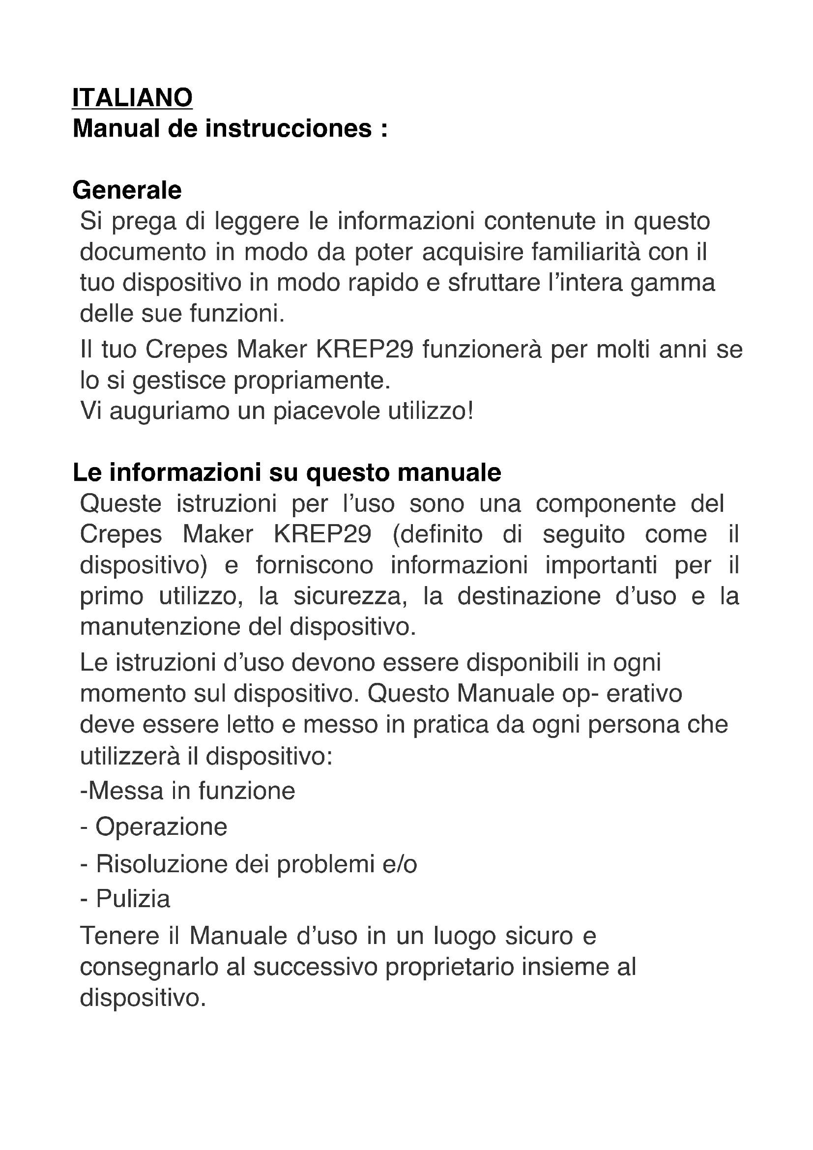 - Cottura di crepes e mini pan-cakes L’utilizzo per uno scopo diverso o per uno scopo che vada oltre a ciò che è descritto è considerato incompatible con l’uso previsto o designato. AVVERTIMENTO Pericolo dovuto ad uso improprio! I pericoli possono derivare dal dispositivo se viene utilizzato per un uso improprio e / o un differ- ente dal suo reale utilizzo. > Utilizzare l’apparecchio esclusivamente per la sua destinazione d’uso. > Attenersi alle modalità procedurali descritte in questo Manuale. Reclami di tutti i tipi dovuti a danni derivanti da usi impropri sono esclusi. L’Utente se ne assume il rischio. Informazioni generali di sicurezza NOTA Si prega di osservare i seguenti avvisi generali di sicurezza per quanto riguarda la manipolazione sicura del dispositivo.