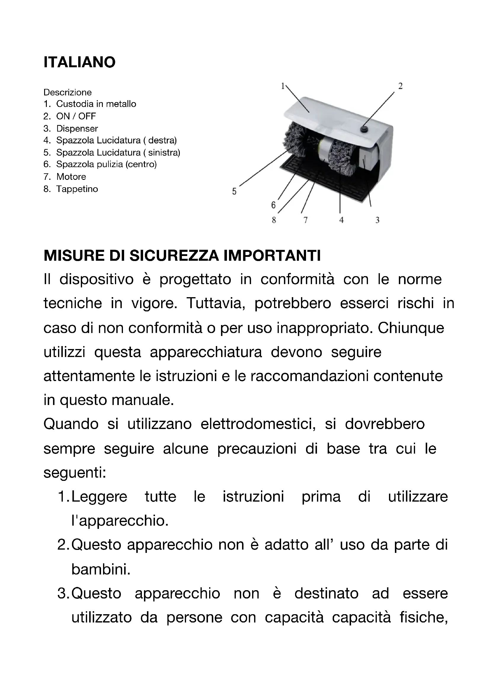 mano e di consegnarlo al futuro proprietario in caso di trasferimento del dispositivo.Manuale per la macchina di pulizia scarpe