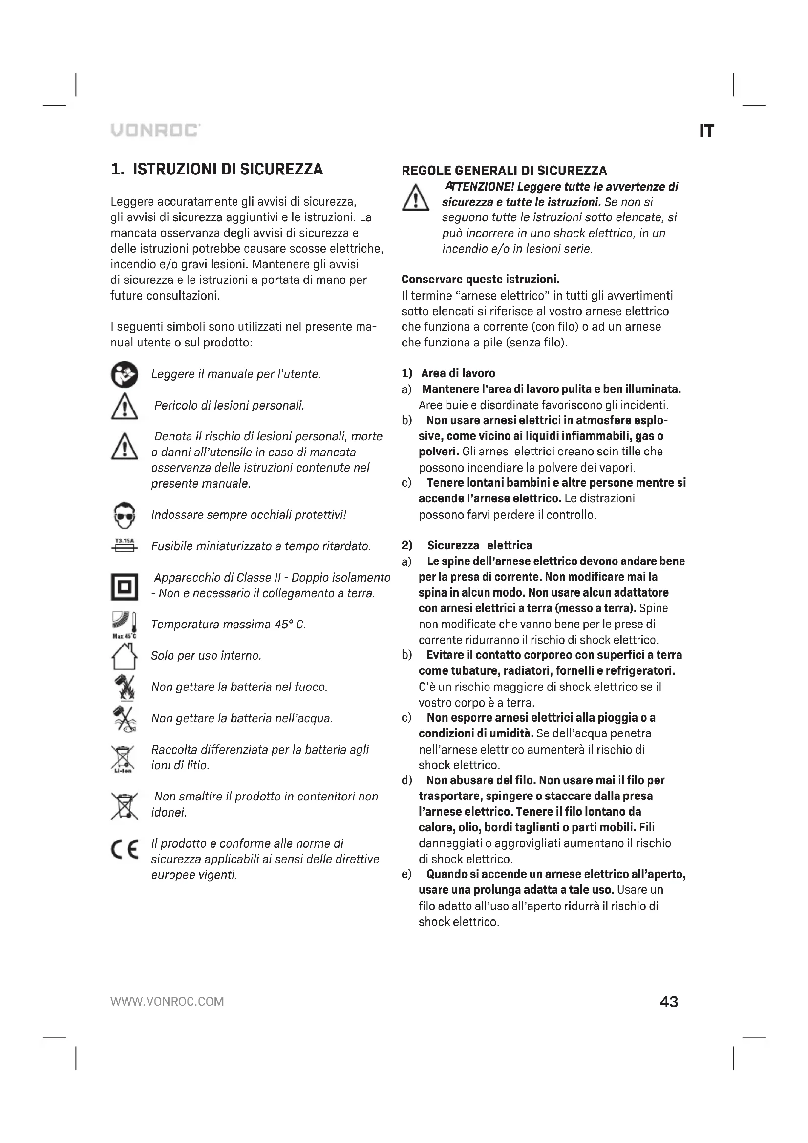 a) Non aprire la batteria. Pericolo di cortocircuito. b) Proteggere la batteria dal calore, ad esempio dalla luce solare intensa, dal fuoco, dall’acqua e dall’umidita. Pericolo di esplosione. c) In caso di danni e uso improprio della batteria, potrebbero essere emessi dei vapori. Venti- lare l’area e rivolgersi a un medico in caso di malessere. I vapori possono irritare il Sistema respiratorio. d) Utilizzare la batteria solo in combinazione con il prodotto Vonroc. Questo accorgimento proteg- ge la batteria da un sovraccarico pericoloso. e) La batteria puo essere danneggiata da oggetti appuntiti come chiodi o cacciaviti o da una forza applicata esternamente. Si puo verifi care un cortocircuito interno e la batteria potrebbe bruciare, fumare, esplodere o surriscaldarsi.46