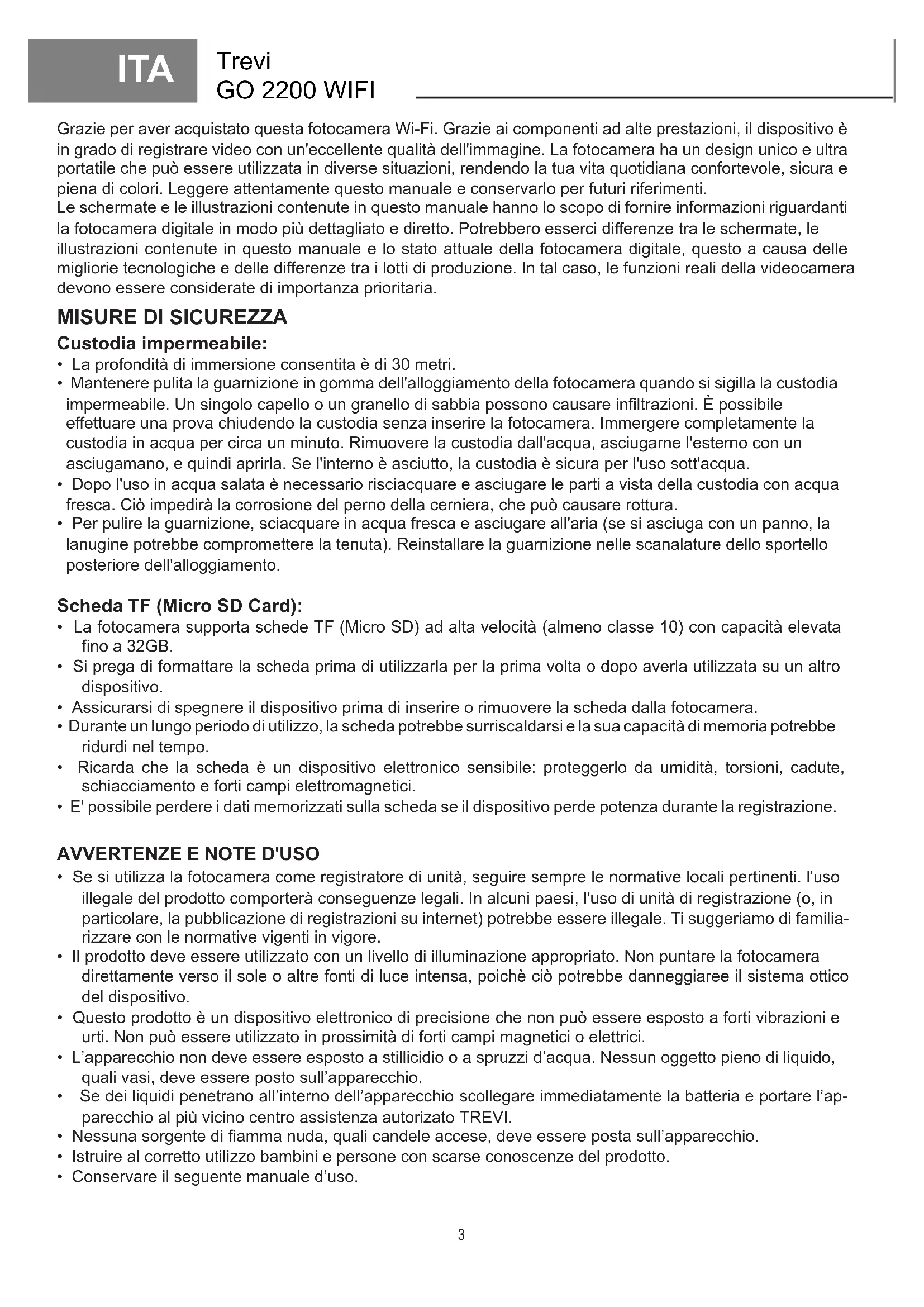 SPECIFICHE TECNICHE Display: ...................................... 2" LTPS Lente: ...................................... 120°A + Wide angle lens Sensore: ...................................... CMOS 5Mpxl Risoluzione registrazioni Video: ................................ 30FPS 1080FHD (1920x 1080) interpolata 30FPS 1080p (1440x 1080) interpolata 30FPS 720p (1280x 720) 30FPS WVGA (848x 480) 30FPS VGA (640x 480) 30FPS QVGA (320x 240) Formato Video: ...................................... AVI Risoluzione Foto: ...................................... 12M/10M/8M/5M/3M Memoria massima supportata: .................................. Micro SDHC classe 10 16GB - 32GB Modalità Foto: ...................................... Singolo/ Autoscatto/ Scatto continuo Frequenza Wi-Fi: ...................................... 2,4GHz Potenza Wi-Fi: ...................................... 1,5mW Compatibilità Wi-Fi: ...................................... iOS 6.1 superiori, Android 4.0 superiori Funzione Wi-Fi: ...................................... Trasmissione di immagini, controllo remoto, impostazione, sincronizz. e condivisione di album Frequenza: ...................................... 50Hz/ 60Hz Connessioni: ...................................... USB 2.0 Alimentazione: ...................................... 5V, 1A Capacità batteria: ...................................... 3,7V, 900mAh Durata della batteria: ...................................... In 1080p circa 100 minuti Tempo di ricarica: ...................................... circa 2 ore Compatibilità sistemi operativi: .................................. Windows XP/7/8SP3A/Vista/Win7 e superiori Mac 10.5 superiori Dimensioni: ...................................... 59x 41x 29,8mm Peso: ...................................... 58 gr con batteria ITA9 Trevi GO 2200 WIFI INFORMAZIONI AGLI UTENTI ai sensi del Decreto Legislativo N°49 del 14 Marzo 2014 “Attuazione della Direttiva 2012/19/UE sui riuti di apparecchiature elettriche ed elettroniche (RAEE)” Il simbolo del cassonetto barrato riportato sull’apparecchiatura indica che il prodotto alla ne della propria vita utile deve essere raccolto separatamente dagli altri riuti. L’utente dovrà, pertanto, conferire l’apparecchiatura integra dei componenti essenziali giunta a ne vita agli idonei centri di raccolta dierenziata dei riuti elettronici ed elettrotecnici, oppure riconsegnarla al rivenditore al momento dell’acquisto di nuova apparecchiatura di tipo equivalente, in ragione di uno a uno, oppure 1 a zero per le apparecchiature aventi lato maggiore inferiore a 25cm. L’adeguata raccolta dierenziata per l’avvio successivo dell’apparecchiatura dimessa al riciclaggio, al trat- tamento e allo smaltimento ambientale compatibile contribuisce ad evitare possibili eetti negativi sull’ambiente e sulla salute e favorisce il riciclo dei materiali di cui è composta l’apparecchiatura. Lo smaltimento abusivo del prodotto da parte dell’utente comporta l’applicazione delle sanzioni amministrative di cui al D.Lgs n. Decreto Legislativo N°49 del 14 Marzo 2014. ITA10 Trevi GO 2200 WIFI Thank you for purchasing this Wi-Fi camera. Thanks to the high-performance components, the device is capable of recording videos with excellent image quality. The camera has a unique and ultra-portable design that can be used in dierent situations, making your daily life comfortable, safe and full of color. Read this manual carefully and keep it for future reference. The screenshots and illustrations in this manual are intended to provide you with more detailed and straightforward information about your digital camera. There may be dierences between the screenshots, illustrations contained in this manual and the current state of the digital camera, due to technological improvements and dierences between production batches. In such a case, the actual functions of the camera should be considered as a priority. SAFETY MEASURES Waterproof casing: