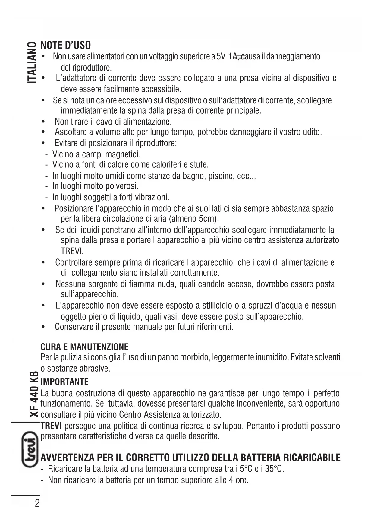 Per la pulizia si consiglia l’uso di un panno morbido, leggermente inumidito. Evitate solventi o sostanze abrasive. IMPORTANTE La buona costruzione di questo apparecchio ne garantisce per lungo tempo il perfetto funzionamento. Se, tuttavia, dovesse presentarsi qualche inconveniente, sarà opportuno consultare il più vicino Centro Assistenza autorizzato. TREVI persegue una politica di continua ricerca e sviluppo. Pertanto i prodotti possono presentare caratteristiche diverse da quelle descritte. AVVERTENZA PER IL CORRETTO UTILIZZO DELLA BATTERIA RICARICABILE - Ricaricare la batteria ad una temperatura compresa tra i 5°C e i 35°C. - Non ricaricare la batteria per un tempo superiore alle 4 ore. ITALIANOXF 440 KB