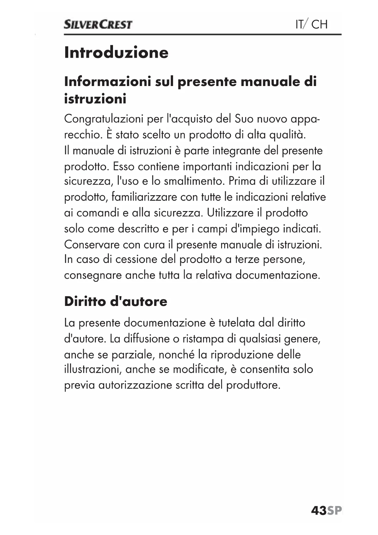 Introduzione Informazioni sul presente manuale di istruzioni Congratulazioni per l'acquisto del Suo nuovo appa- recchio. È stato scelto un prodotto di alta qualità. Il manuale di istruzioni è parte integrante del presente prodotto. Esso contiene importanti indicazioni per la sicurezza, l'uso e lo smaltimento. Prima di utilizzare il prodotto, familiarizzare con tutte le indicazioni relative ai comandi e alla sicurezza. Utilizzare il prodotto solo come descritto e per i campi d'impiego indicati. Conservare con cura il presente manuale di istruzioni. In caso di cessione del prodotto a terze persone, consegnare anche tutta la relativa documentazione. Diritto d'autore La presente documentazione è tutelata dal diritto d'autore. La diffusione o ristampa di qualsiasi genere, anche se parziale, nonché la riproduzione delle illustrazioni, anche se modificate, è consentita solo previa autorizzazione scritta del produttore.44 SPB 2.600 B1