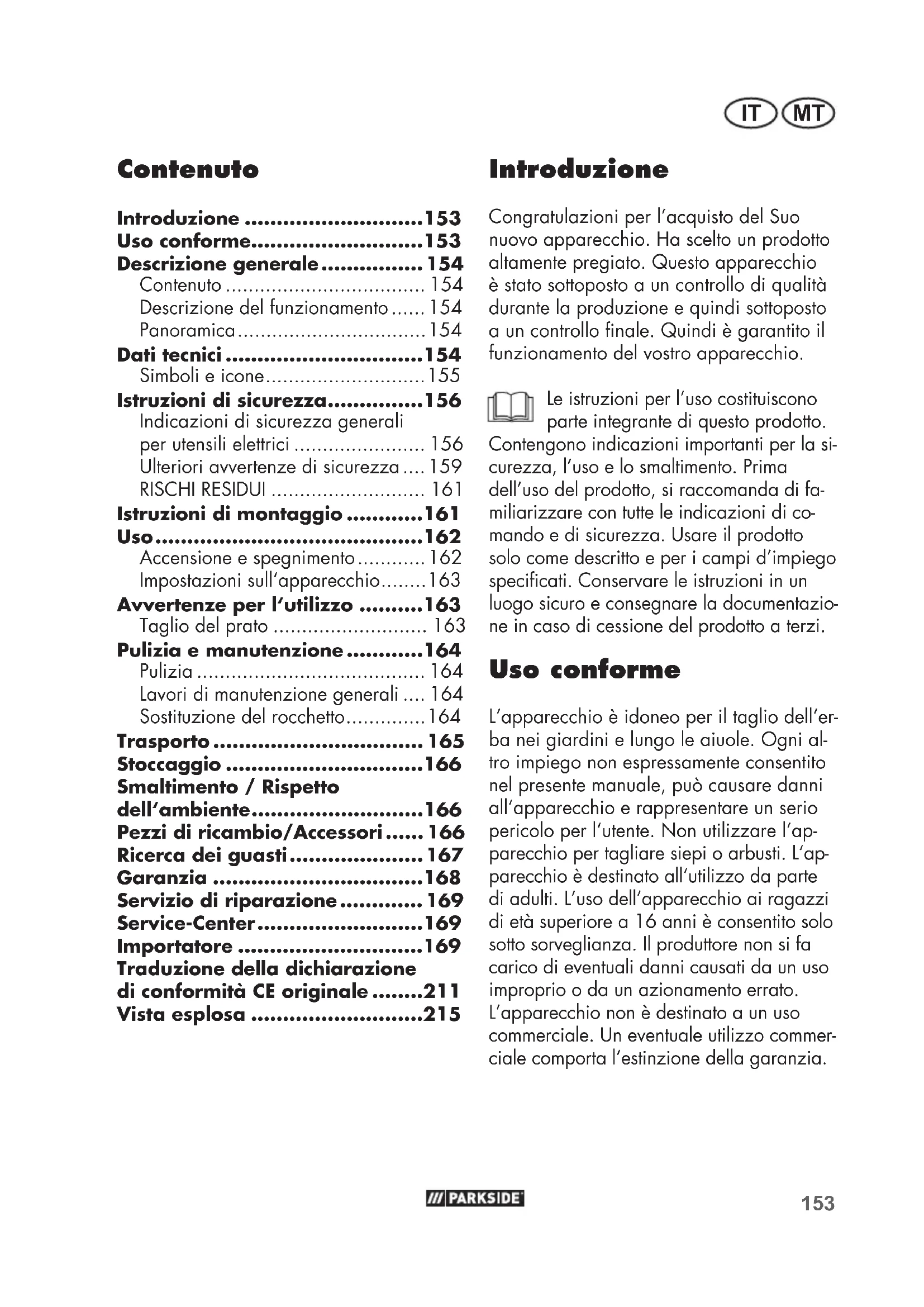 - Vista esplosa Introduzione Congratulazioni per l’acquisto del Suo nuovo apparecchio. Ha scelto un prodotto altamente pregiato. Questo apparecchio è stato sottoposto a un controllo di qualità durante la produzione e quindi sottoposto a un controllo nale. Quindi è garantito il funzionamento del vostro apparecchio. Le istruzioni per l’uso costituiscono parte integrante di questo prodotto. Contengono indicazioni importanti per la si- curezza, l’uso e lo smaltimento. Prima dell’uso del prodotto, si raccomanda di fa- miliarizzare con tutte le indicazioni di co- mando e di sicurezza. Usare il prodotto solo come descritto e per i campi d’impiego specicati. Conservare le istruzioni in un luogo sicuro e consegnare la documentazio- ne in caso di cessione del prodotto a terzi. Uso conforme L‘apparecchio è idoneo per il taglio dell‘er- ba nei giardini e lungo le aiuole. Ogni al- tro impiego non espressamente consentito nel presente manuale, può causare danni all‘apparecchio e rappresentare un serio pericolo per l‘utente. Non utilizzare l‘ap- parecchio per tagliare siepi o arbusti. L‘ap- parecchio è destinato all‘utilizzo da parte di adulti. L’uso dell’apparecchio ai ragazzi di età superiore a 16 anni è consentito solo sotto sorveglianza. Il produttore non si fa carico di eventuali danni causati da un uso improprio o da un azionamento errato. L’apparecchio non è destinato a un uso commerciale. Un eventuale utilizzo commer- ciale comporta l’estinzione della garanzia.154 IT MT Descrizione generale L’immagine dei principali com- ponenti funzionali é riportata nella pagina ripiegabile davanti e dietro. Contenuto Estrarre l‘apparecchio dall‘imballo e veri- carne l‘integrità. - Tagliabordi elettrico - Copertura di protezione - Rocchetto portalo (già montato) - Viti a croce - Impugnatura supplementare - Manuale di istruzioni originale Descrizione del funzionamento Il decespugliatore elettrico portatile e a controllo manuale presenta un rocchetto portalo come dispositivo di taglio. Per proteggere l‘utente l‘apparecchio ha un dispositivo di protezione che copre il gruppo di taglio. La seguente descrizione illustra il funzionamento dei componenti. Panoramica 1 Interruttore On/Off 2 Impugnatura superiore 3 Scarico trazione 4 Cavo di alimentazione 5 Impugnatura 6 Pezzo intermedio 7 Testa motore 8 Copertura di protezione 9 Testina di taglio 10 Impugnatura supplementare p. 215
