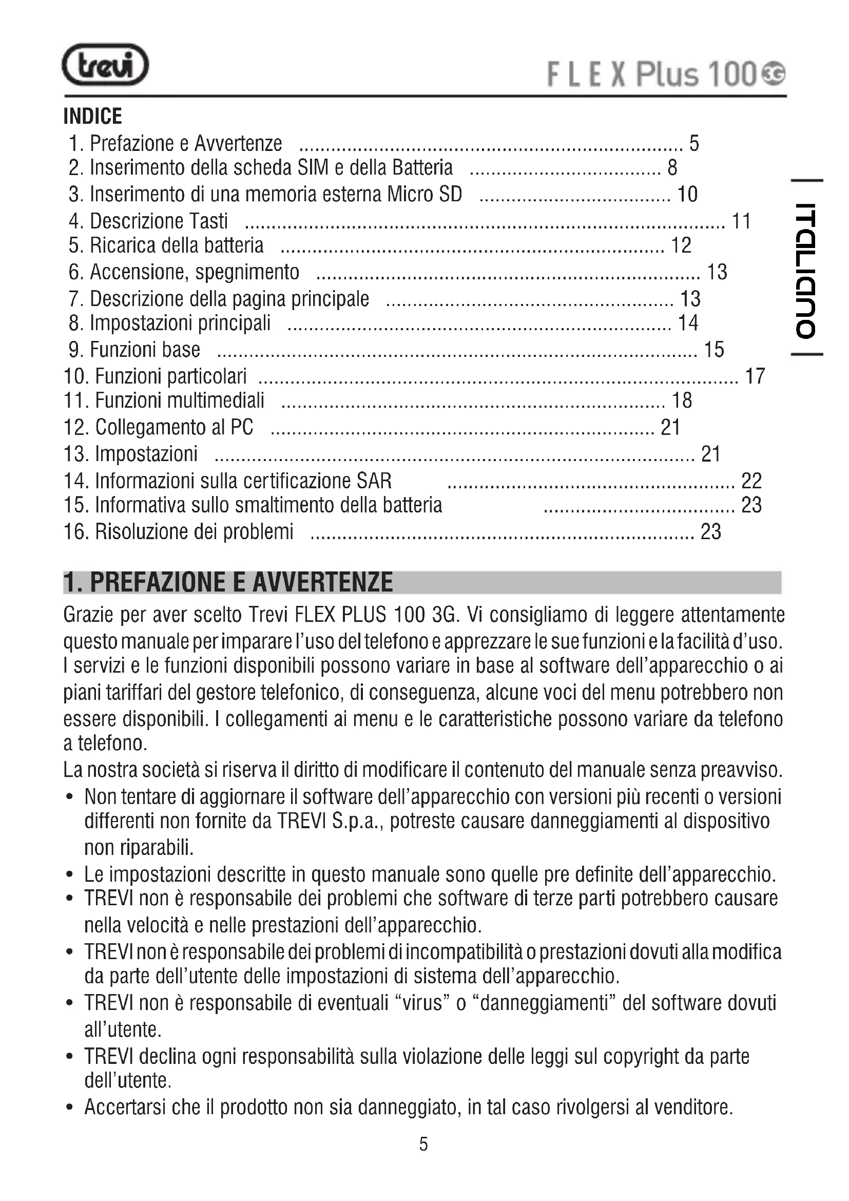 Grazie per aver scelto Trevi FLEX PLUS 100 3G. Vi consigliamo di leggere attentamente questo manuale per imparare l’uso del telefono e apprezzare le sue funzioni e la facilità d’uso. I servizi e le funzioni disponibili possono variare in base al software dell’apparecchio o ai piani tariffari del gestore telefonico, di conseguenza, alcune voci del menu potrebbero non essere disponibili. I collegamenti ai menu e le caratteristiche possono variare da telefono a telefono. La nostra società si riserva il diritto di modificare il contenuto del manuale senza preavviso.