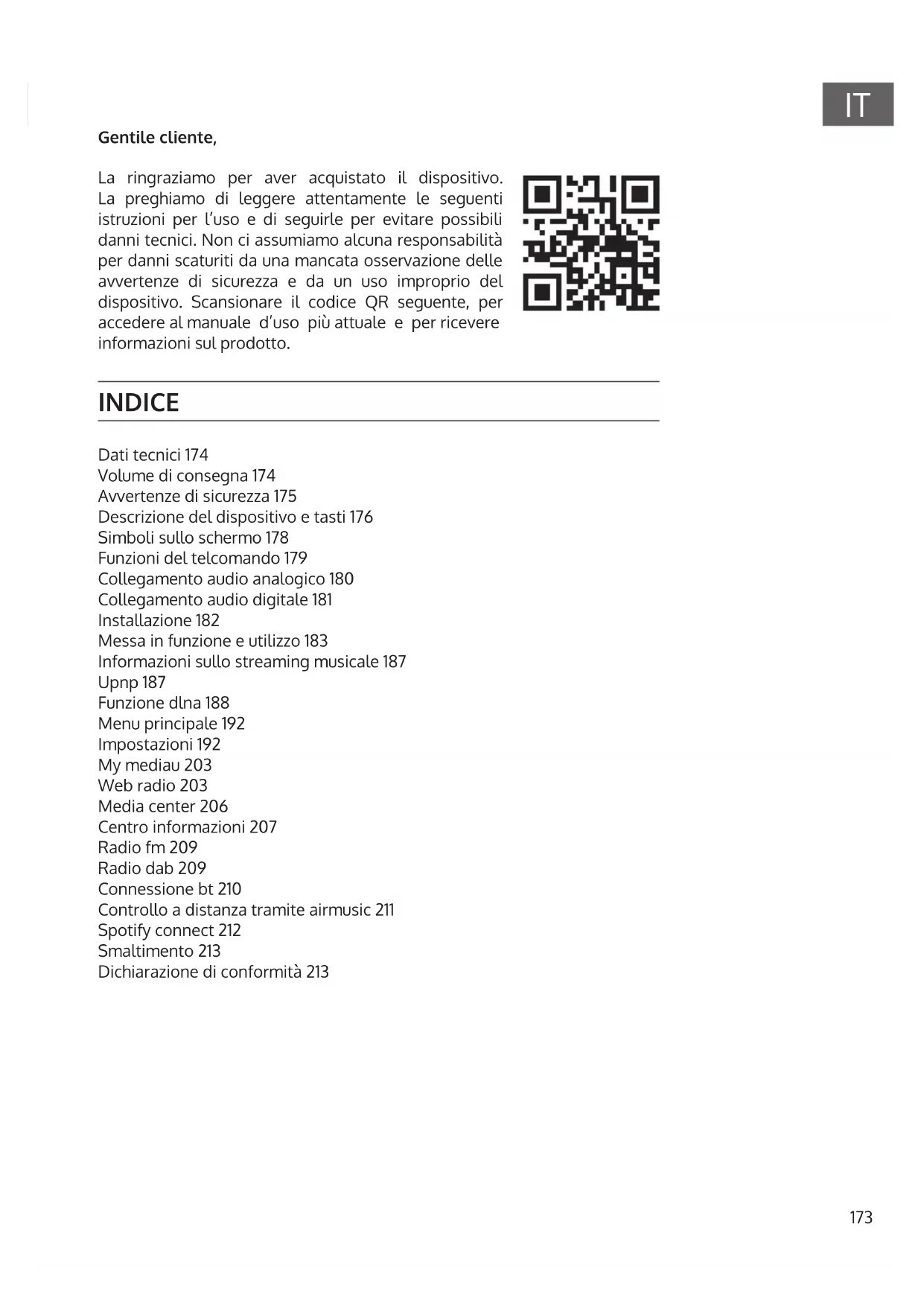 Gentile cliente, La ringraziamo per aver acquistato il dispositivo. La preghiamo di leggere attentamente le seguenti istruzioni per l’uso e di seguirle per evitare possibili danni tecnici. Non ci assumiamo alcuna responsabilità per danni scaturiti da una mancata osservazione delle avvertenze di sicurezza e da un uso improprio del dispositivo. Scansionare il codice QR seguente, per accedere al manuale d’uso più attuale e per ricevere informazioni sul prodotto. INDICE Dati tecnici 174 Volume di consegna 174 Avvertenze di sicurezza 175 Descrizione del dispositivo e tasti 176 Simboli sullo schermo 178 Funzioni del telcomando 179 Collegamento audio analogico 180 Collegamento audio digitale 181 Installazione 182 Messa in funzione e utilizzo 183 Informazioni sullo streaming musicale 187 Upnp 187 Funzione dlna 188 Menu principale 192 Impostazioni 192 My mediau 203 Web radio 203 Media center 206 Centro informazioni 207 Radio fm 209 Radio dab 209 Connessione bt 210 Controllo a distanza tramite airmusic 211 Spotify connect 212 Smaltimento 213 Dichiarazione di conformità 213174