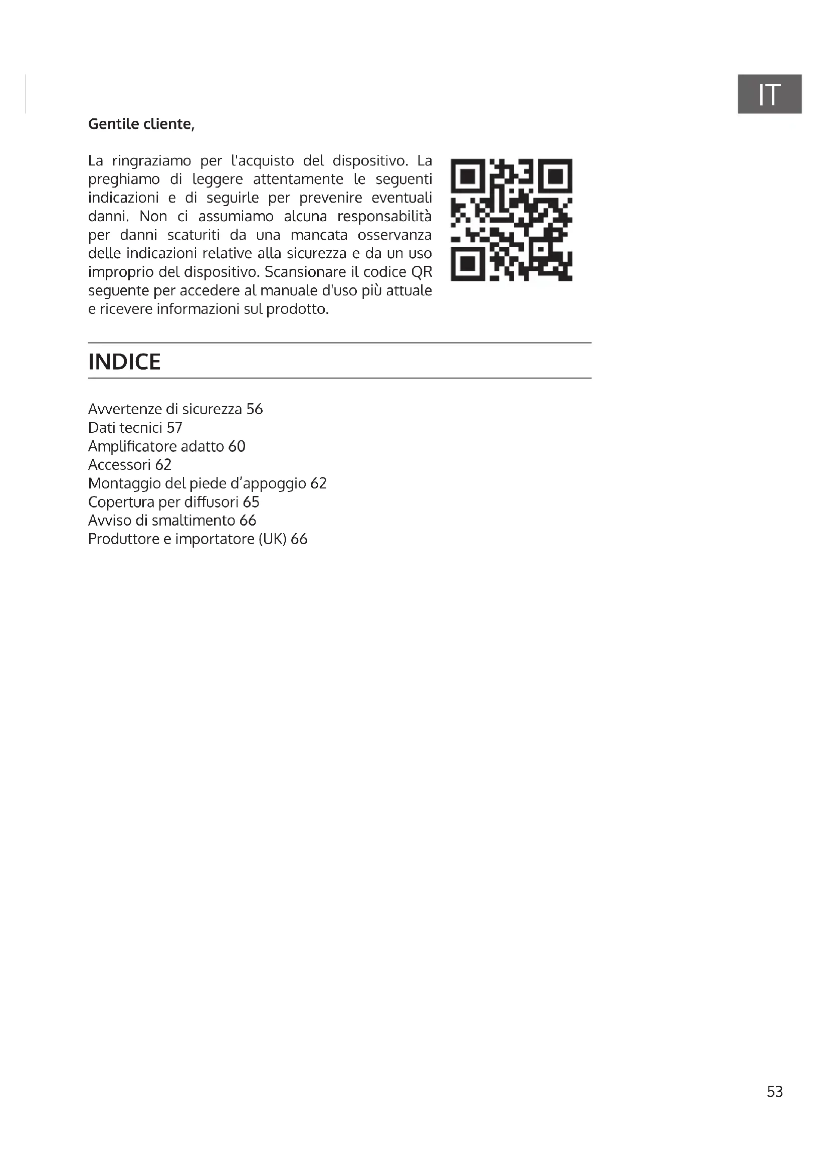 Gentile cliente, La ringraziamo per l'acquisto del dispositivo. La preghiamo di leggere attentamente le seguenti indicazioni e di seguirle per prevenire eventuali danni. Non ci assumiamo alcuna responsabilità per danni scaturiti da una mancata osservanza delle indicazioni relative alla sicurezza e da un uso improprio del dispositivo. Scansionare il codice QR seguente per accedere al manuale d'uso più attuale e ricevere informazioni sul prodotto. INDICE Avvertenze di sicurezza 56 Dati tecnici 57 Amplicatore adatto 60 Accessori 62 Montaggio del piede d’appoggio 62 Copertura per diusori 65 Avviso di smaltimento 66 Produttore e importatore (UK) 6654