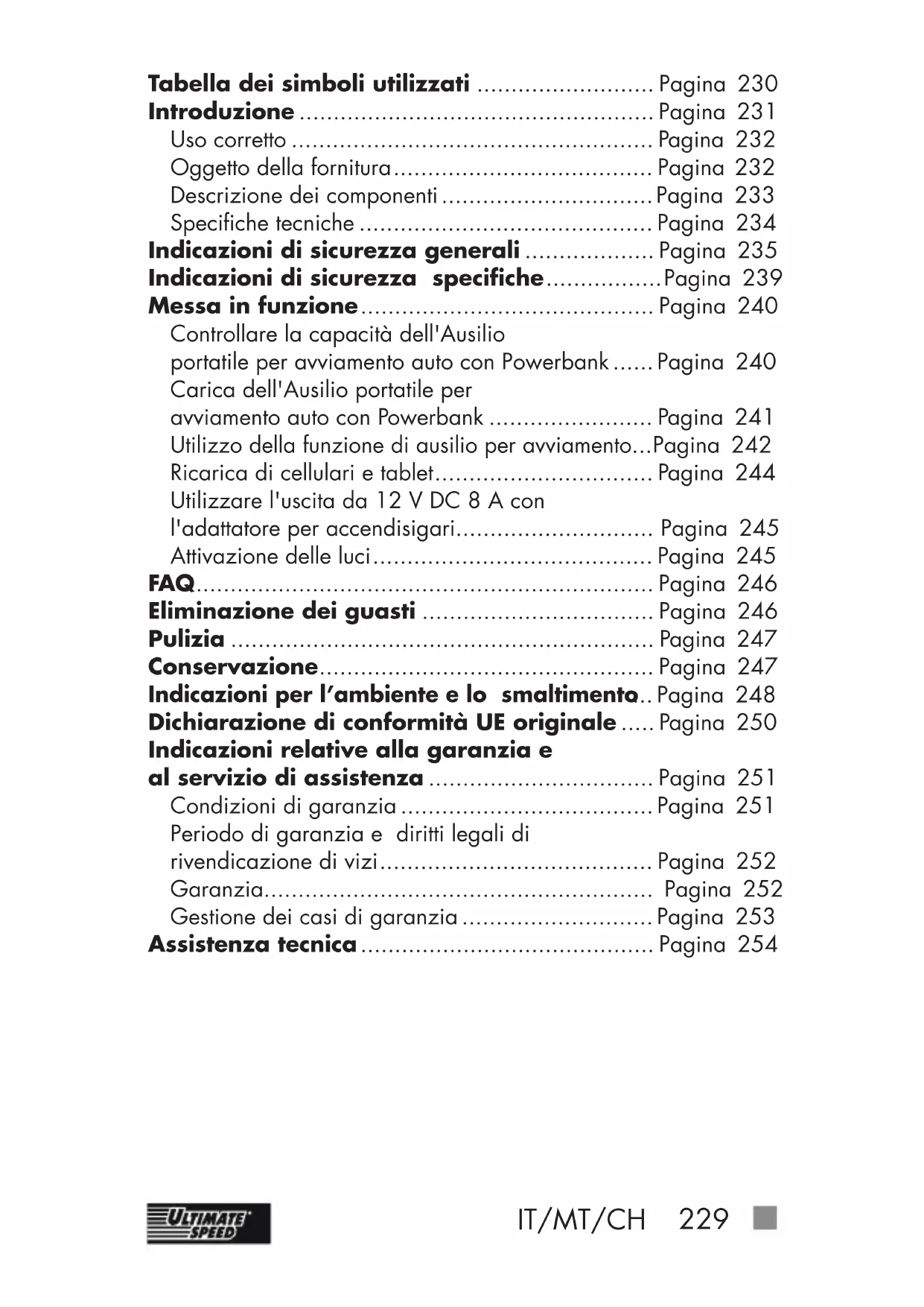 Tabella dei simboli utilizzati .......................... Pagina 230 Introduzione .................................................... Pagina 231 Uso corretto ..................................................... Pagina 232 Oggetto della fornitura ...................................... Pagina 232 Descrizione dei componenti ............................... Pagina 233 Specifiche tecniche ........................................... Pagina 234 Indicazioni di sicurezza generali ................... Pagina 235 Indicazioni di sicurezza specifiche ................. Pagina 239 Messa in funzione ........................................... Pagina 240 Controllare la capacità dell'Ausilio portatile per avviamento auto con Powerbank ...... Pagina 240 Carica dell'Ausilio portatile per avviamento auto con Powerbank ........................ Pagina 241 Utilizzo della funzione di ausilio per avviamento ... Pagina 242 Ricarica di cellulari e tablet ................................ Pagina 244 Utilizzare l'uscita da 12 V DC 8 A con l'adattatore per accendisigari............................. Pagina 245 Attivazione delle luci ......................................... Pagina 245 FAQ ................................................................... Pagina 246 Eliminazione dei guasti .................................. Pagina 246 Pulizia .............................................................. Pagina 247 Conservazione ................................................. Pagina 247 Indicazioni per l’ambiente e lo smaltimento ... Pagina 248 Dichiarazione di conformità UE originale ..... Pagina 250 Indicazioni relative alla garanzia e al servizio di assistenza ................................. Pagina 251 Condizioni di garanzia ..................................... Pagina 251 Periodo di garanzia e diritti legali di rivendicazione divizi ........................................ Pagina 252 Garanzia......................................................... Pagina 252 Gestione dei casi di garanzia ............................ Pagina 253 Assistenza tecnica ........................................... Pagina 254230 IT/MT/CH z Tabella dei simboli utilizzati Leggere le istruzioni per l'uso! Nota bene! Rispettare le indicazioni di pericolo e sicurezza. La lampada LED non è idonea all'illuminazione di ambienti domestici. -21°C La lampada LED è idonea all’uso in presenza di temperature estreme fino a -21 °C. Grado di protezione III L'apparecchio è adatto solo per l’uso in ambiente interno.