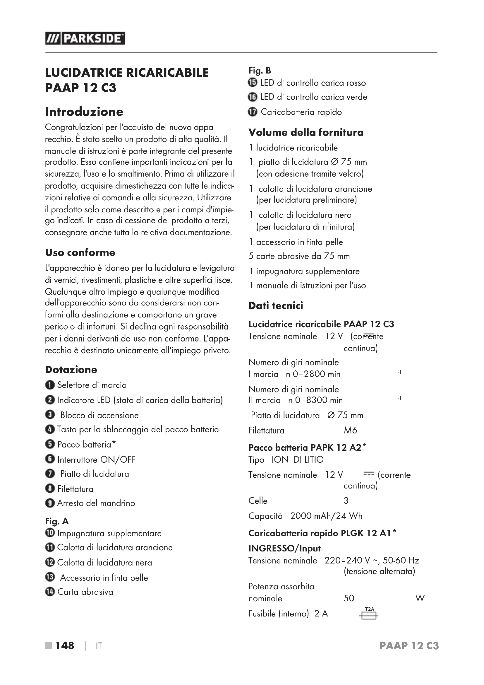 IT PAAP 12 C3 LUCIDATRICE RICARICABILE PAAP 12 C3 Introduzione Congratulazioni per l'acquisto del nuovo appa- recchio. È stato scelto un prodotto di alta qualità. Il manuale di istruzioni è parte integrante del presente prodotto. Esso contiene importanti indicazioni per la sicurezza, l'uso e lo smaltimento. Prima di utilizzare il prodotto, acquisire dimestichezza con tutte le indica- zioni relative ai comandi e alla sicurezza. Utilizzare il prodotto solo come descritto e per i campi d'impie- go indicati. In caso di cessione del prodotto a terzi, consegnare anche tutta la relativa documentazione. Uso conforme L'apparecchio è idoneo per la lucidatura e levigatura di vernici, rivestimenti, plastiche e altre superfici lisce. Qualunque altro impiego e qualunque modifica dell'apparecchio sono da considerarsi non con- formi alla destinazione e comportano un grave pericolo di infortuni. Si declina ogni responsabilità per i danni derivanti da uso non conforme. L'appa- recchio è destinato unicamente all'impiego privato. Dotazione Selettore di marcia Indicatore LED (stato di carica della batteria) Blocco di accensione Tasto per lo sbloccaggio del pacco batteria Pacco batteria* Interruttore ON/OFF Piatto di lucidatura Filettatura Arresto del mandrino Fig. A Impugnatura supplementare Calotta di lucidatura arancione Calotta di lucidatura nera Accessorio in finta pelle Carta abrasiva Fig. B LED di controllo carica rosso LED di controllo carica verde Caricabatteria rapido Volume della fornitura 1 lucidatrice ricaricabile 1 piatto di lucidatura Ø 75 mm (con adesione tramite velcro) 1 calotta di lucidatura arancione (per lucidatura preliminare) 1 calotta di lucidatura nera (per lucidatura di rifinitura) 1 accessorio in finta pelle 5 carte abrasive da 75 mm 1 impugnatura supplementare 1 manuale di istruzioni per l'uso Dati tecnici Lucidatrice ricaricabile PAAP 12 C3 Tensione nominale 12 V (corrente continua) Numero di giri nominale I marcia n 0–2800 min