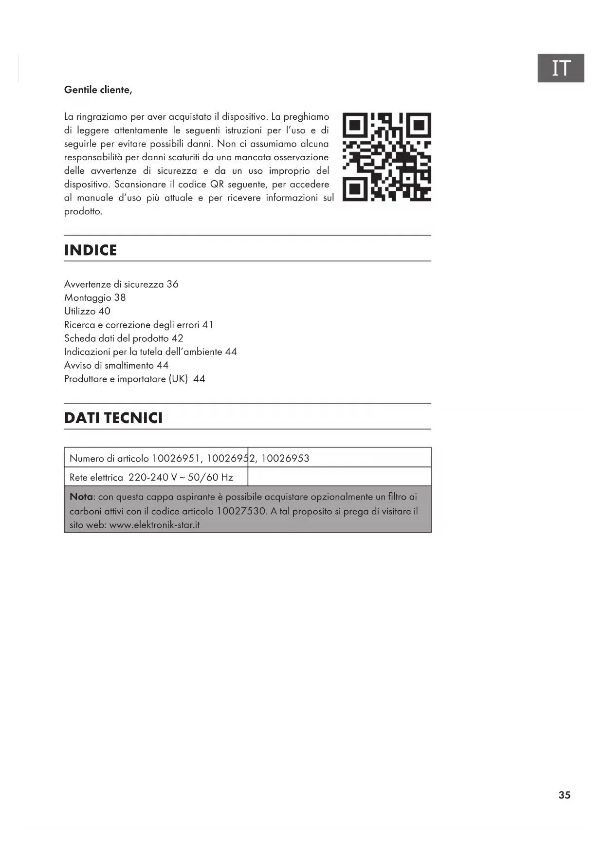 Gentile cliente, La ringraziamo per aver acquistato il dispositivo. La preghiamo di leggere attentamente le seguenti istruzioni per l’uso e di seguirle per evitare possibili danni. Non ci assumiamo alcuna responsabilità per danni scaturiti da una mancata osservazione delle avvertenze di sicurezza e da un uso improprio del dispositivo. Scansionare il codice QR seguente, per accedere al manuale d’uso più attuale e per ricevere informazioni sul prodotto. INDICE Avvertenze di sicurezza36 Montaggio38 Utilizzo40 Ricerca e correzione degli errori41 Scheda dati del prodotto42 Indicazioni per la tutela dell’ambiente44 Avviso di smaltimento44 Produttore e importatore (UK) 44 DATI TECNICI Numero di articolo 10026951, 10026952, 10026953 Rete elettrica 220-240 V ~ 50/60 Hz Nota: con questa cappa aspirante è possibile acquistare opzionalmente un ltro ai carboni attivi con il codice articolo 10027530. A tal proposito si prega di visitare il sito web: www.elektronik-star.it36