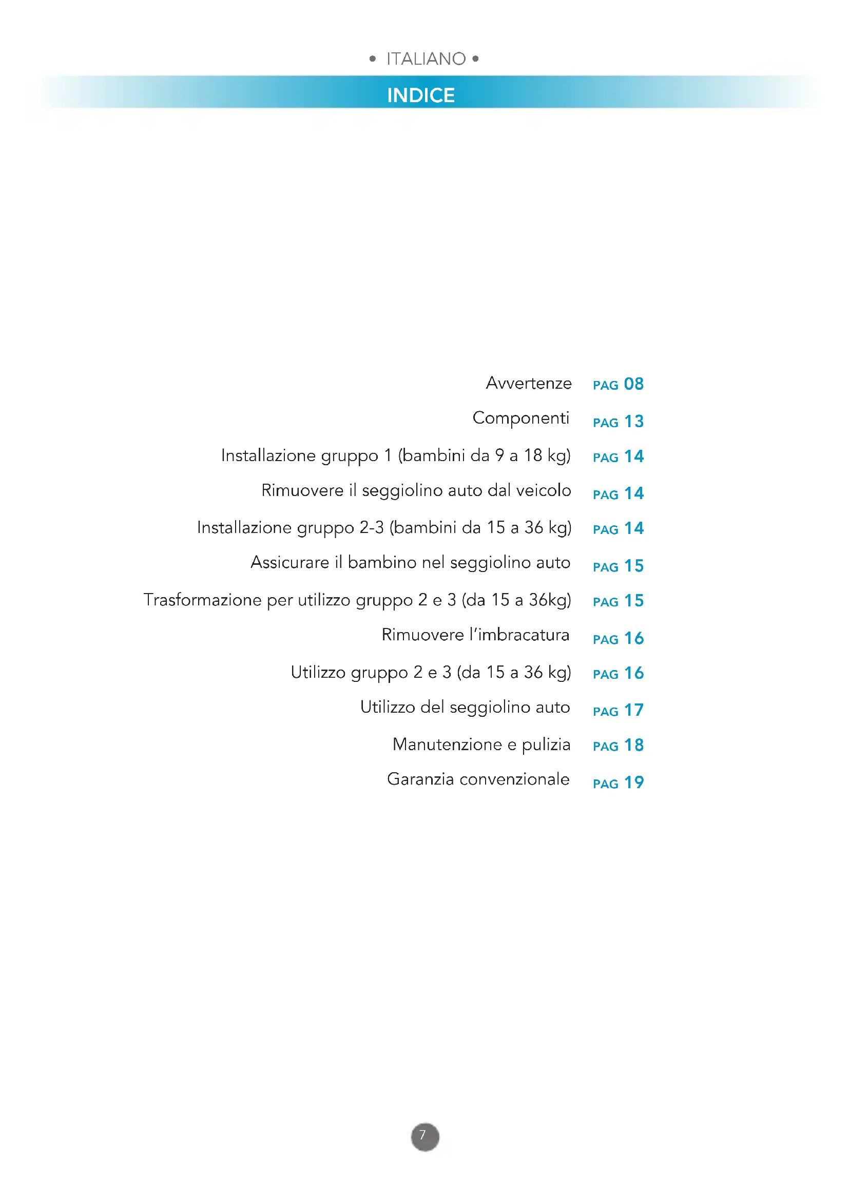 pag 08 pag 13 pag 14 pag 14 pag 14 pag 15 pag 15 pag 16 pag 16 pag 17 pag 18 pag 19 Avvertenze Componenti Installazione gruppo 1 (bambini da 9 a 18 kg) Rimuovere il seggiolino auto dal veicolo Installazione gruppo 2-3 (bambini da 15 a 36 kg) Assicurare il bambino nel seggiolino auto Trasformazione per utilizzo gruppo 2 e 3 (da 15 a 36kg) Rimuovere l’imbracatura Utilizzo gruppo 2 e 3 (da 15 a 36 kg) Utilizzo del seggiolino auto Manutenzione e pulizia Garanzia convenzionale