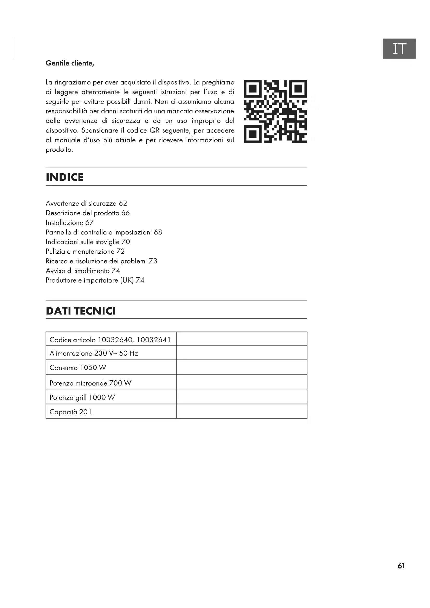 Avvertenze di sicurezza 62 Descrizione del prodotto 66 Installazione 67 Pannello di controllo e impostazioni 68 Indicazioni sulle stoviglie 70 Pulizia e manutenzione 72 Ricerca e risoluzione dei problemi 73 Avviso di smaltimento 74 Produttore e importatore (UK) 74 Gentile cliente, La ringraziamo per aver acquistato il dispositivo. La preghiamo di leggere attentamente le seguenti istruzioni per l’uso e di seguirle per evitare possibili danni. Non ci assumiamo alcuna responsabilità per danni scaturiti da una mancata osservazione delle avvertenze di sicurezza e da un uso improprio del dispositivo. Scansionare il codice QR seguente, per accedere al manuale d’uso più attuale e per ricevere informazioni sul prodotto. INDICE DATI TECNICI Codice articolo 10032640, 10032641 Alimentazione 230 V~ 50 Hz Consumo 1050 W Potenza microonde 700 W Potenza grill 1000 W Capacità 20 L62