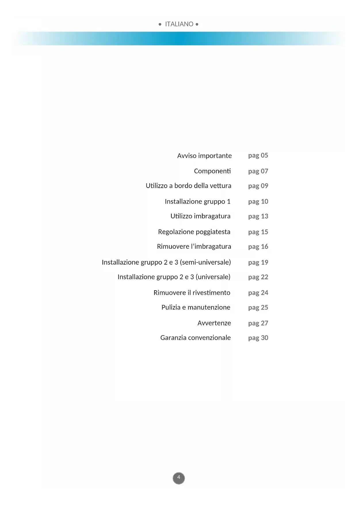 pag 05 pag 07 pag 09 pag 10 pag 13 pag 15 pag 16 pag 19 pag 22 pag 24 pag 25 pag 27 pag 30 Avviso importante Componen Ulizzo a bordo della veura Installazione gruppo 1 Ulizzo imbragatura Regolazione poggiatesta Rimuovere l’imbragatura Installazione gruppo 2 e 3 (semi-universale) Installazione gruppo 2 e 3 (universale) Rimuovere il rivesmento Pulizia e manutenzione Avvertenze Garanzia convenzionale• ITALIANO •