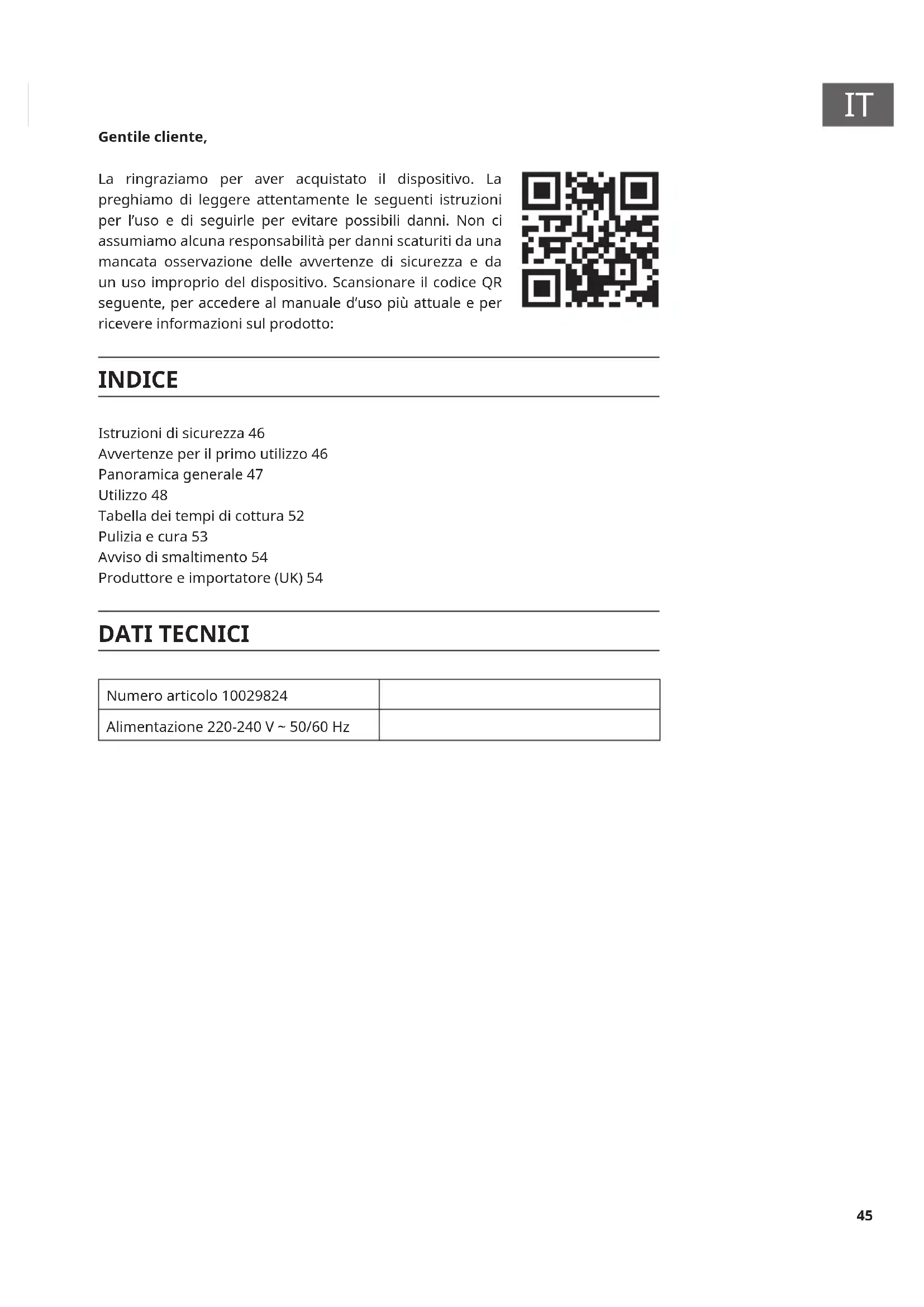 Gentile cliente, La ringraziamo per aver acquistato il dispositivo. La preghiamo di leggere attentamente le seguenti istruzioni per l’uso e di seguirle per evitare possibili danni. Non ci assumiamo alcuna responsabilità per danni scaturiti da una mancata osservazione delle avvertenze di sicurezza e da un uso improprio del dispositivo. Scansionare il codice QR seguente, per accedere al manuale d’uso più attuale e per ricevere informazioni sul prodotto: INDICE Istruzioni di sicurezza 46 Avvertenze per il primo utilizzo 46 Panoramica generale 47 Utilizzo 48 Tabella dei tempi di cottura 52 Pulizia e cura 53 Avviso di smaltimento 54 Produttore e importatore (UK) 54 DATI TECNICI Numero articolo 10029824 Alimentazione 220-240 V ~ 50/60 Hz46