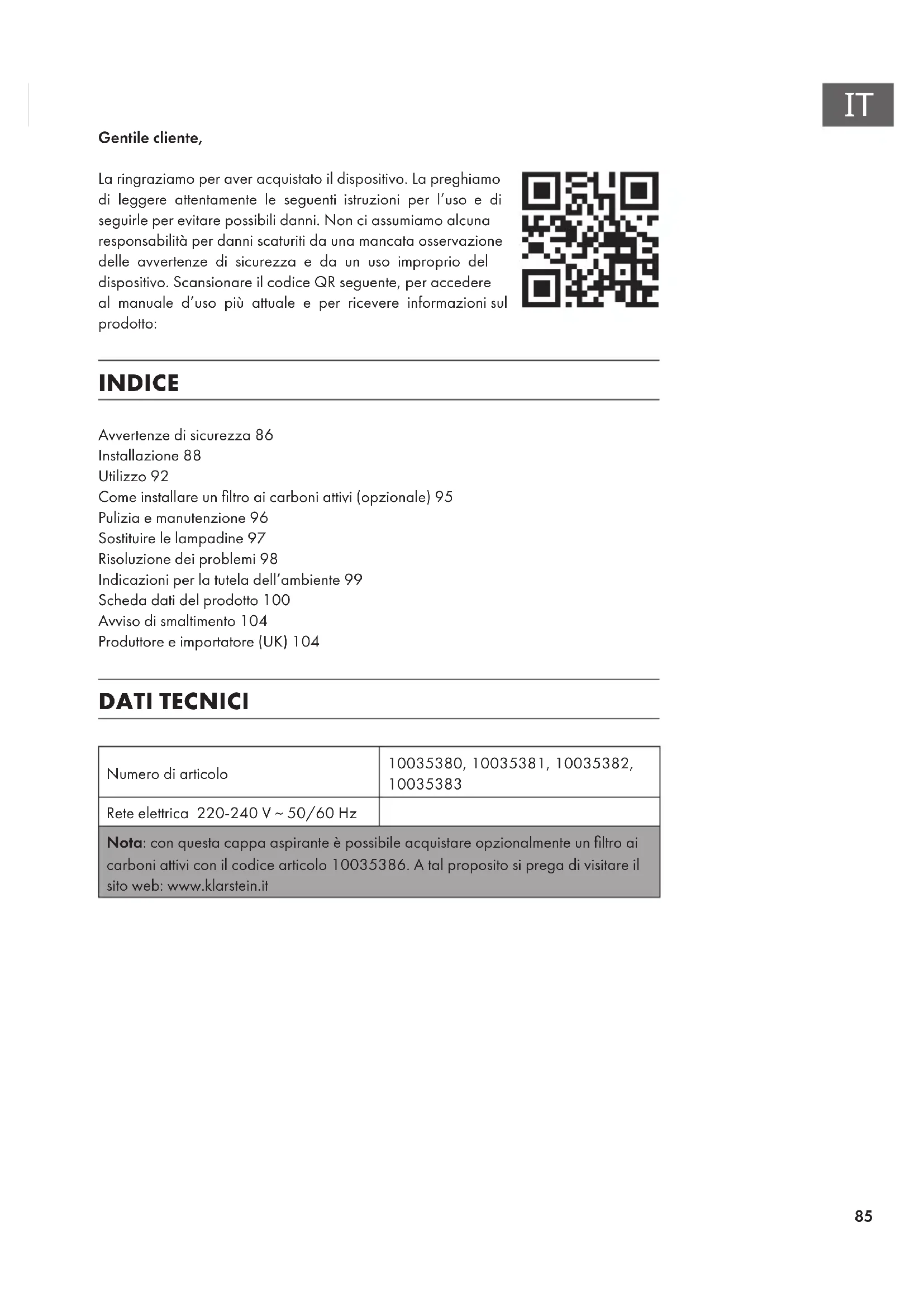 Gentile cliente, La ringraziamo per aver acquistato il dispositivo. La preghiamo di leggere attentamente le seguenti istruzioni per l’uso e di seguirle per evitare possibili danni. Non ci assumiamo alcuna responsabilità per danni scaturiti da una mancata osservazione delle avvertenze di sicurezza e da un uso improprio del dispositivo. Scansionare il codice QR seguente, per accedere al manuale d’uso più attuale e per ricevere informazioni sul prodotto: INDICE Avvertenze di sicurezza86 Installazione88 Utilizzo92 Come installare un ltro ai carboni attivi (opzionale)95 Pulizia e manutenzione96 Sostituire le lampadine97 Risoluzione dei problemi98 Indicazioni per la tutela dell’ambiente99 Scheda dati del prodotto100 Avviso di smaltimento104 Produttore e importatore (UK)104 DATI TECNICI Numero di articolo 10035380, 10035381, 10035382,