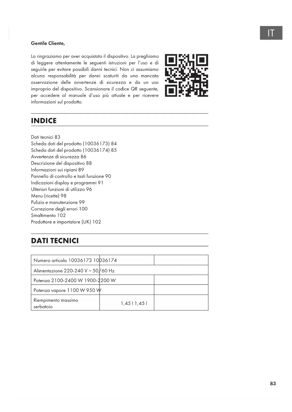Gentile Cliente, La ringraziamo per aver acquistato il dispositivo. La preghiamo di leggere attentamente le seguenti istruzioni per l’uso e di seguirle per evitare possibili danni tecnici. Non ci assumiamo alcuna responsabilità per danni scaturiti da una mancata osservazione delle avvertenze di sicurezza e da un uso improprio del dispositivo. Scansionare il codice QR seguente, per accedere al manuale d’uso più attuale e per ricevere informazioni sul prodotto. INDICE Dati tecnici83 Scheda dati del prodotto (10036173)84 Scheda dati del prodotto (10036174)85 Avvertenze di sicurezza86 Descrizione del dispositivo88 Informazioni sui ripiani89 Pannello di controllo e tasti funzione90 Indicazioni display e programmi91 Ulteriori funzioni di utilizzo96 Menu (ricette)98 Pulizia e manutenzione99 Correzione degli errori100 Smaltimento102 Produttore e importatore (UK)102 DATI TECNICI Numero articolo 10036173 10036174 Alimentazione 220-240 V ~ 50/60 Hz Potenza 2100-2400 W 1900-2200 W Potenza vapore 1100 W 950 W Riempimento massimo serbatoio 1,45 l 1,45 l84