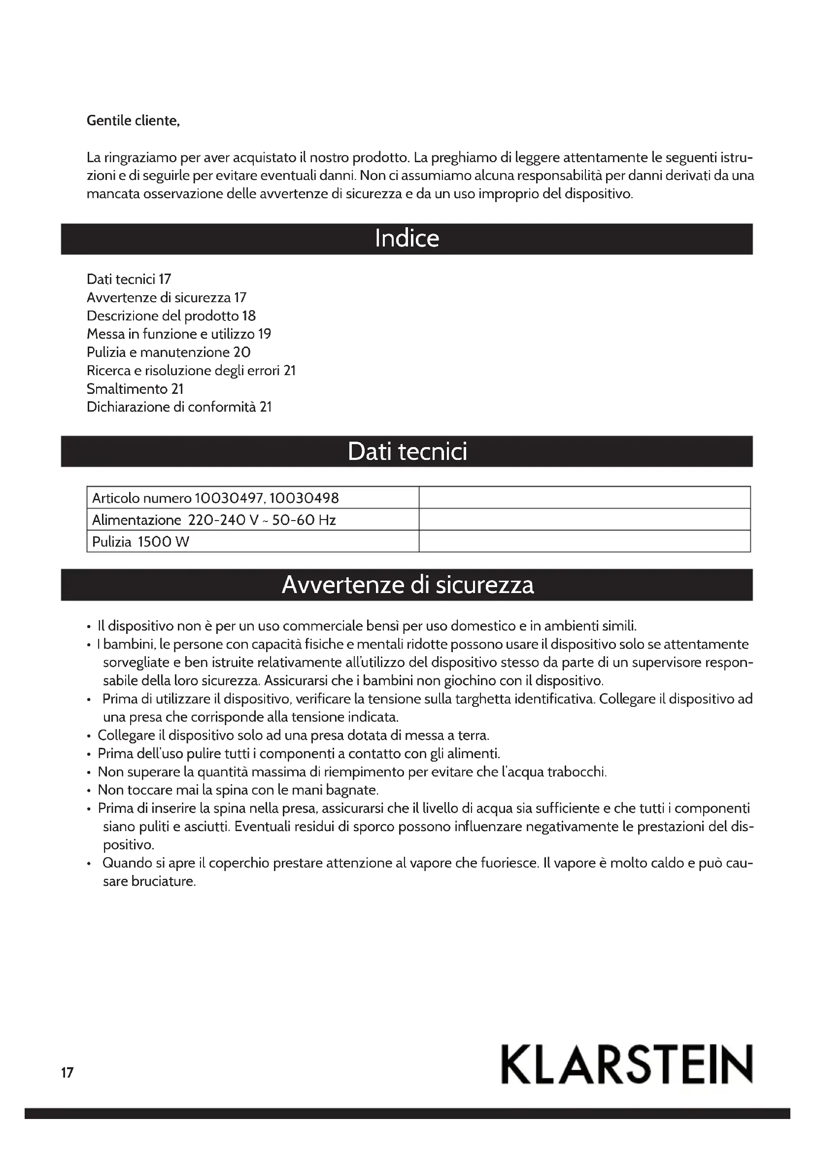 Scarica le istruzioni per il tuo Cuocivapore in formato PDF gratuitamente! Trova il tuo manuale Steam Spa - Klarstein e riprendi in mano il tuo dispositivo elettronico. In questa pagina sono pubblicati tutti i documenti necessari per l'utilizzo del tuo dispositivo. Steam Spa del marchio Klarstein.