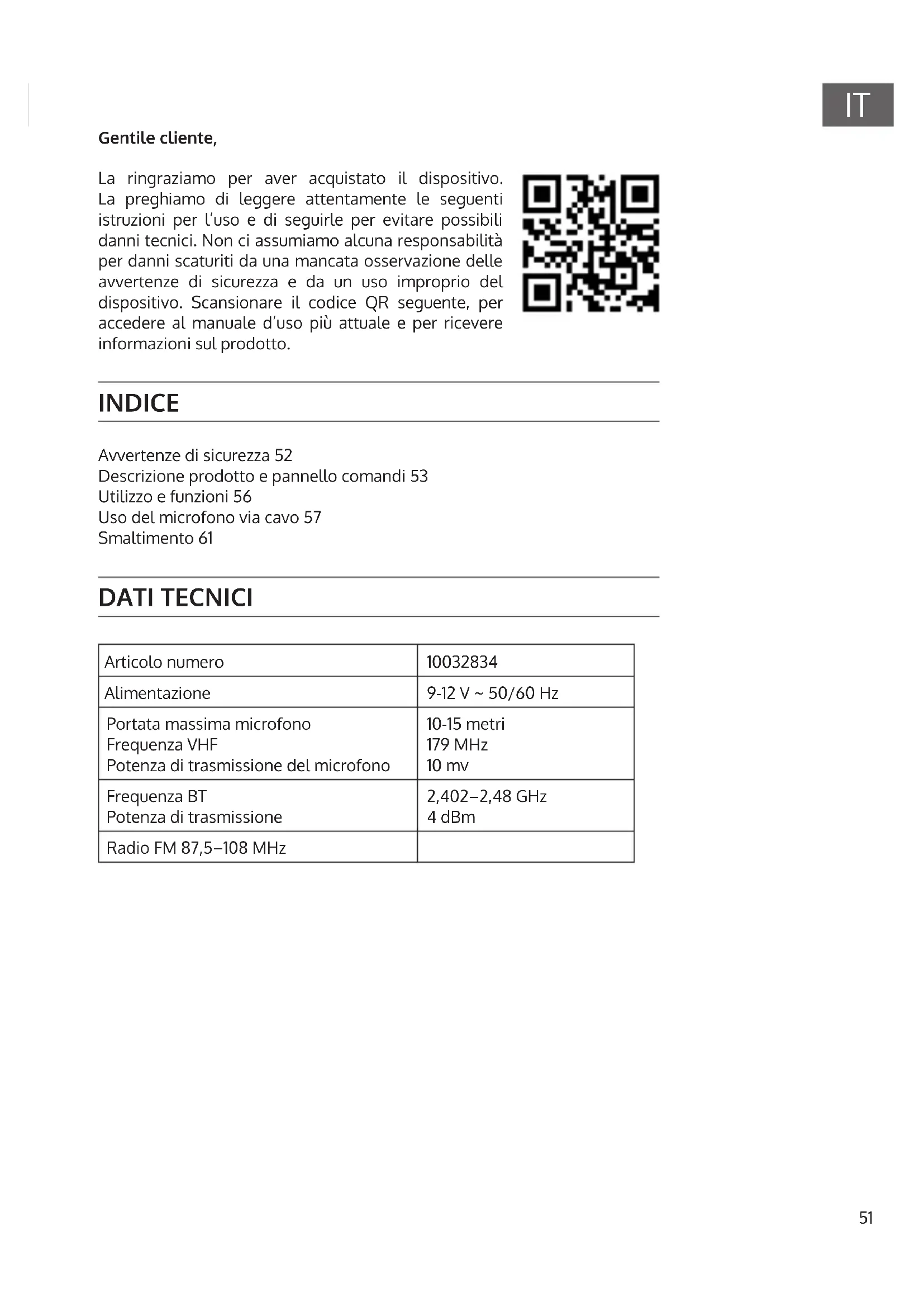 Gentile cliente, La ringraziamo per aver acquistato il dispositivo. La preghiamo di leggere attentamente le seguenti istruzioni per l’uso e di seguirle per evitare possibili danni tecnici. Non ci assumiamo alcuna responsabilità per danni scaturiti da una mancata osservazione delle avvertenze di sicurezza e da un uso improprio del dispositivo. Scansionare il codice QR seguente, per accedere al manuale d’uso più attuale e per ricevere informazioni sul prodotto. INDICE Avvertenze di sicurezza 52 Descrizione prodotto e pannello comandi 53 Utilizzo e funzioni 56 Uso del microfono via cavo 57 Smaltimento 61 DATI TECNICI Articolo numero