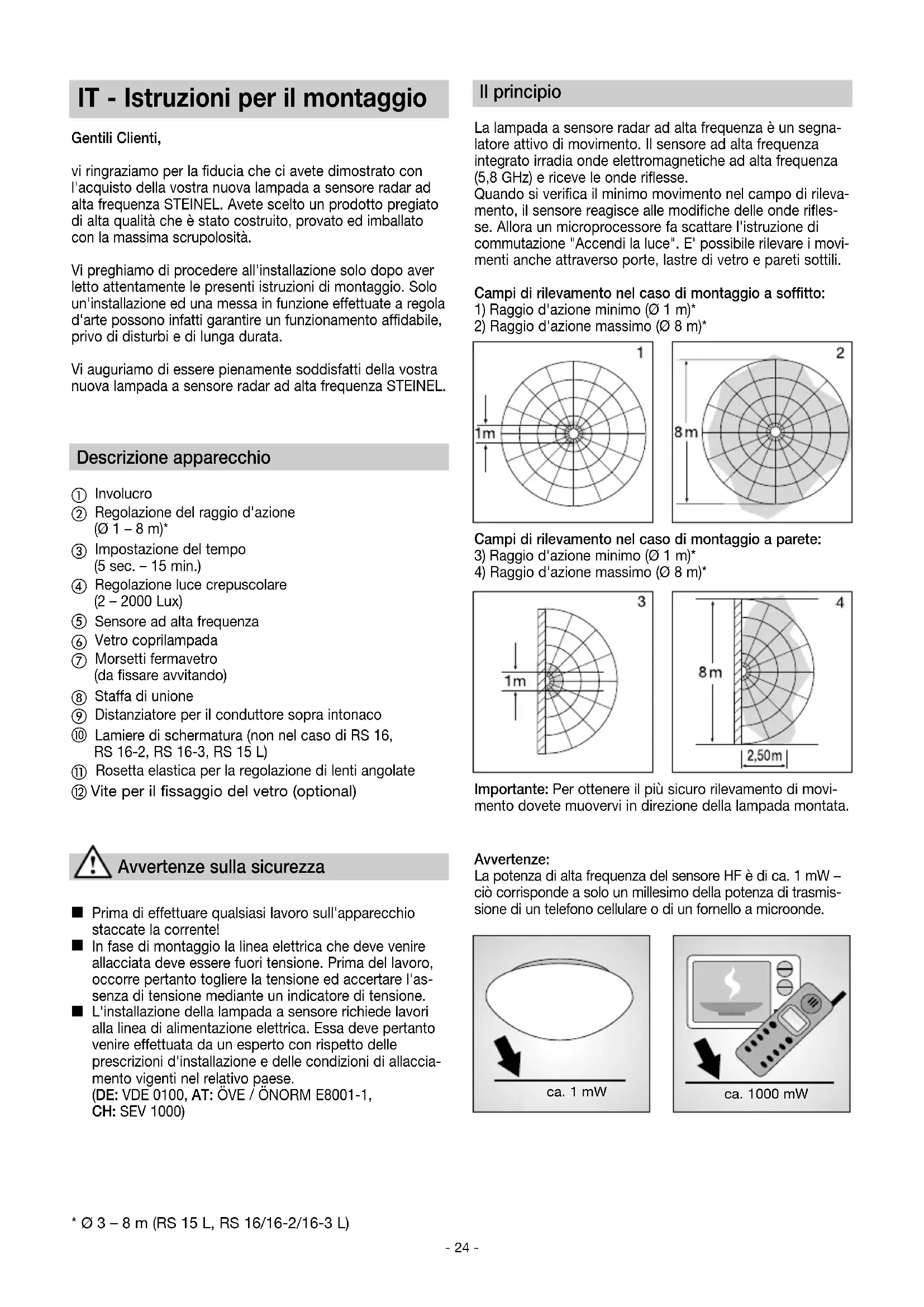 FABRIEKS JAAR GARANTIE Serie RS_110077119_BDAL Serie RS_24spr_neu.qxp 09.11.21 12:42 Seite 24IT - Istruzioni per il montaggio Gentili Clienti, vi ringraziamo per la fiducia che ci avete dimostrato con l'acquisto della vostra nuova lampada a sensore radar ad alta frequenza STEINEL. Avete scelto un prodotto pregiato di alta qualità che è stato costruito, provato ed imballato con la massima scrupolosità. Vi preghiamo di procedere all'installazione solo dopo aver letto attentamente le presenti istruzioni di montaggio. Solo un'installazione ed una messa in funzione effettuate a regola d'arte possono infatti garantire un funzionamento affidabile, privo di disturbi e di lunga durata. Vi auguriamo di essere pienamente soddisfatti della vostra nuova lampada a sensore radar ad alta frequenza STEINEL. Descrizione apparecchio