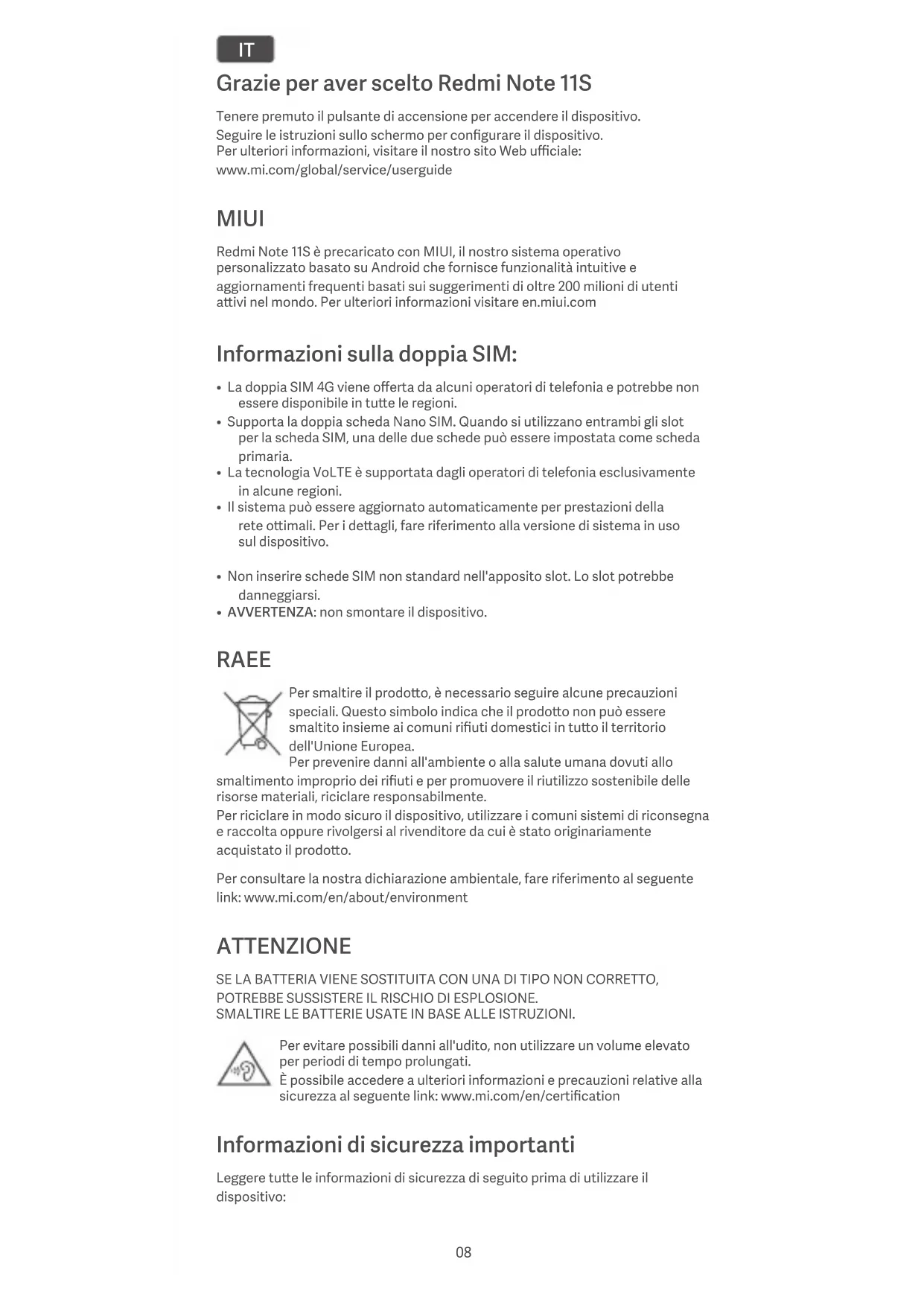 - AVVERTENZA: non smontare il dispositivo. RAEE Per smaltire il prodoo, è necessario seguire alcune precauzioni speciali. Questo simbolo indica che il prodoo non può essere smaltito insieme ai comuni rifiuti domestici in tuo il territorio dell'Unione Europea. Per prevenire danni all'ambiente o alla salute umana dovuti allo smaltimento improprio dei rifiuti e per promuovere il riutilizzo sostenibile delle risorse materiali, riciclare responsabilmente. Per riciclare in modo sicuro il dispositivo, utilizzare i comuni sistemi di riconsegna e raccolta oppure rivolgersi al rivenditore da cui è stato originariamente acquistato il prodoo. Per consultare la nostra dichiarazione ambientale, fare riferimento al seguente link: www.mi.com/en/about/environment ATTENZIONE SE LA BATTERIA VIENE SOSTITUITA CON UNA DI TIPO NON CORRETTO, POTREBBE SUSSISTERE IL RISCHIO DI ESPLOSIONE. SMALTIRE LE BATTERIE USATE IN BASE ALLE ISTRUZIONI. Per evitare possibili danni all'udito, non utilizzare un volume elevato per periodi di tempo prolungati. È possibile accedere a ulteriori informazioni e precauzioni relative alla sicurezza al seguente link: www.mi.com/en/certification Informazioni di sicurezza importanti Leggere tue le informazioni di sicurezza di seguito prima di utilizzare il dispositivo: 08• L'uso di cavi, alimentatori o baerie non autorizzati può provocare incendi, esplosioni o comportare altri rischi.