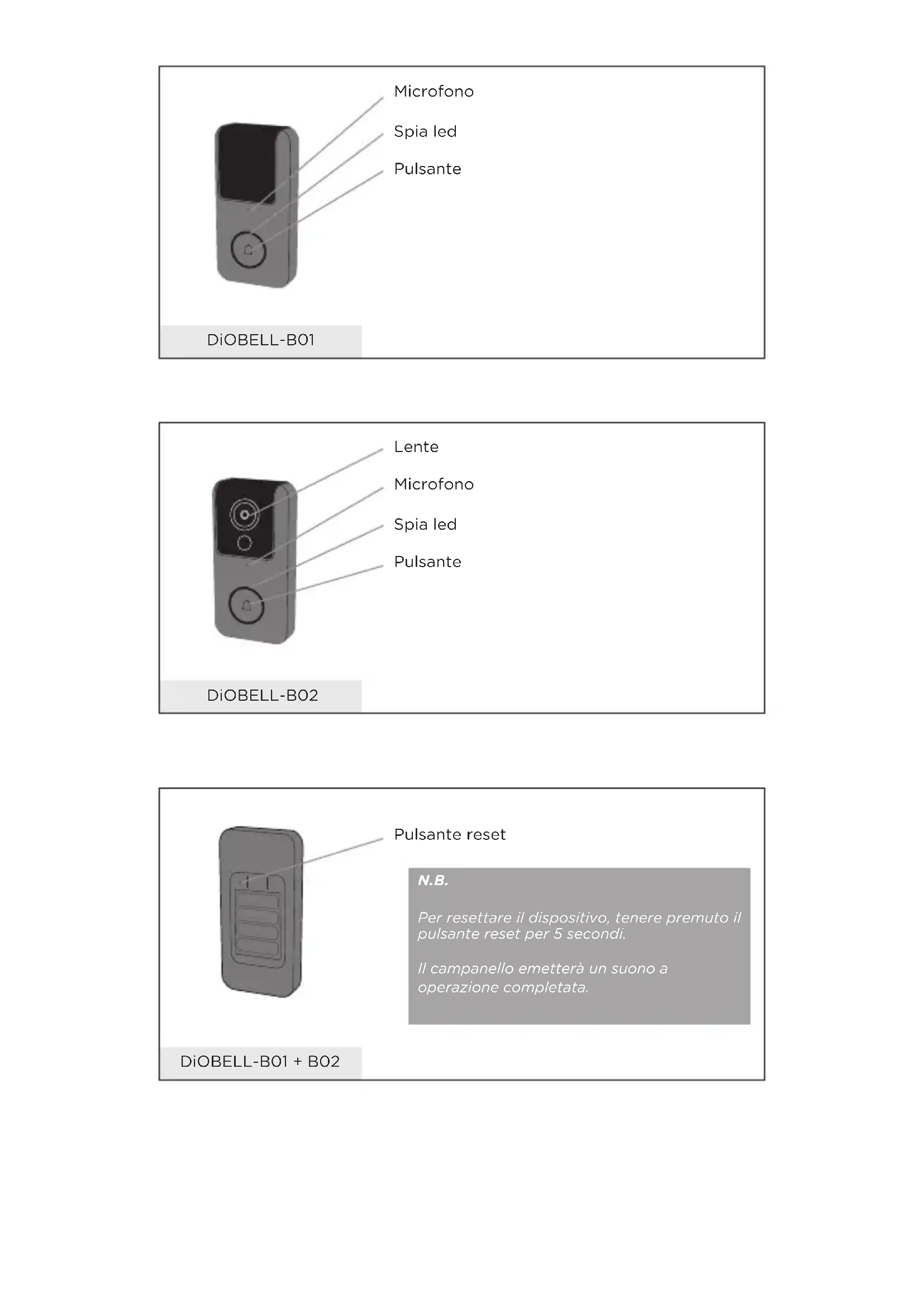 name Microfono Spia led Pulsante Lente Microfono Spia led Pulsante Pulsante reset DiOBELL-B01 DiOBELL-B02 DiOBELL-B01 + B02 N.B. Per resettare il dispositivo, tenere premuto il pulsante reset per 5 secondi. Il campanello emetterà un suono a operazione completata.3. Istruzioni di montaggio