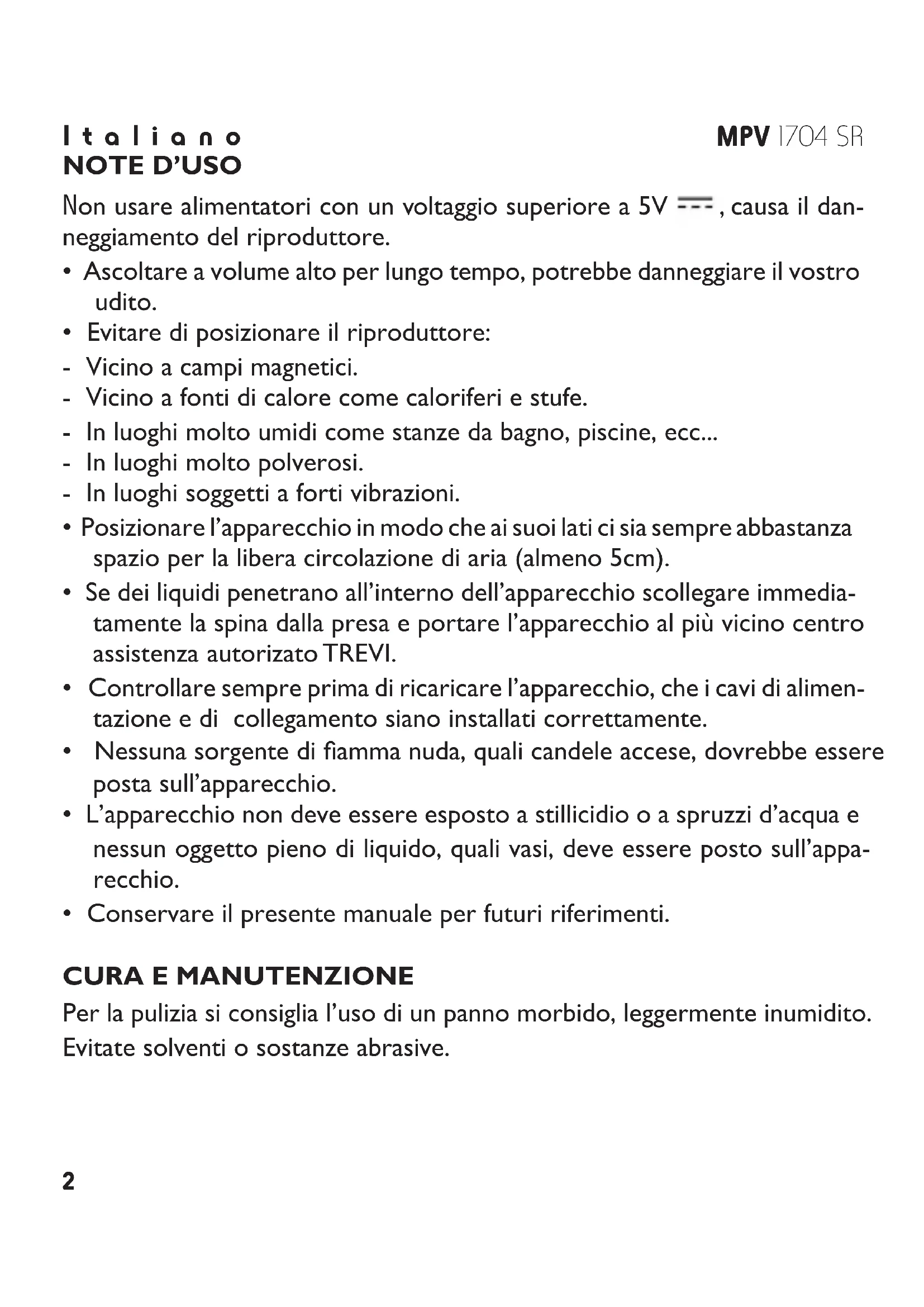 IMPORTANTE La buona costruzione di questo apparecchio ne garantisce per lungo tempo il perfetto funzionamento. Se tuttavia dovesse presentarsi qualche inconve- niente, sarà opportuno consultare il più vicino Centro Assistenza autorizzato. TREVI persegue una politica di continua ricerca e sviluppo. Pertanto i prodotti possono presentare caratteristiche diverse da quelle descritte. AVVERTENZA PER IL CORRETTO UTILIZZO DELLA BATTERIA RICARICABILE - Ricaricare la batteria ad una temperatura compresa tra i 5°C e i 35°C. - Non prolungare la ricarica oltre i tempi indicati per evitare il rischio di surriscaldamento e scoppio. - Non ricaricare la batteria per un tempo superiore alle 4 ore. - La ricarica della batteria oltre i tempi indicati o un prolungato periodo di inattività possono ridurne la durata. - La batteria ricaricabile è soggetta ad usura e la sua capacità diminuisce gradualmente. - Per prolungare la durata della batteria, utilizzarla quando è completamente carica no al completo scaricamento, quindi ricaricarla completamente di nuovo prima di utilizzarla nuovamente. Mettendo in carica una batteria non completamente esaurita, la sua durata risulterà ridotta. In questo caso, ripetere il ciclo caricamento/scaricamento completo più volte. - Evitare di tenere la batteria sotto carica tutta la notte. Attenzione! L’uso inappropriato della batteria può causare esplosioni o surriscaldamenti della stessa. Per evitare possibili danni all’udito, limitare il tempo di ascolto a volumi elevati. ItalianoMPV 1704 SR