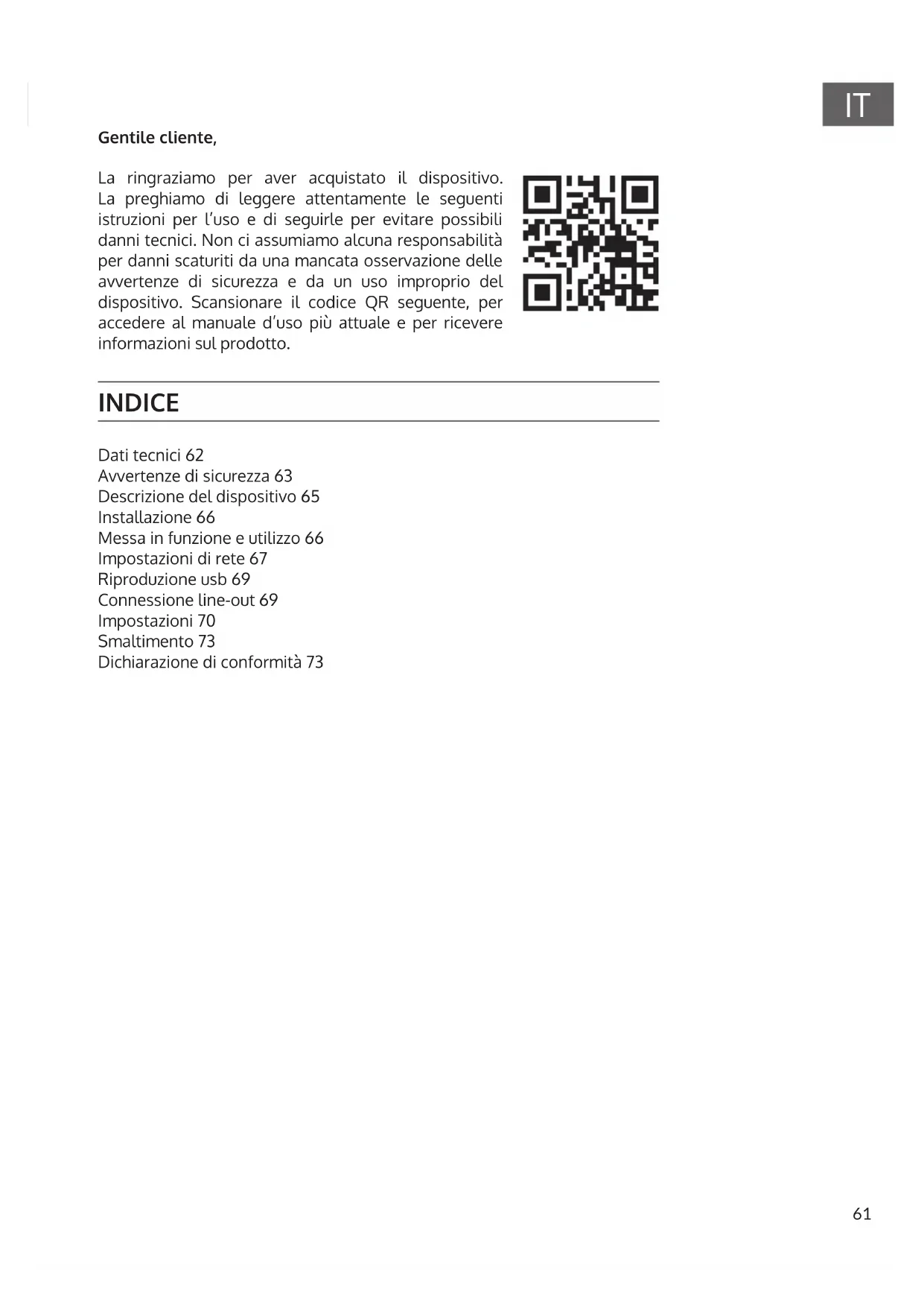 Gentile cliente, La ringraziamo per aver acquistato il dispositivo. La preghiamo di leggere attentamente le seguenti istruzioni per l’uso e di seguirle per evitare possibili danni tecnici. Non ci assumiamo alcuna responsabilità per danni scaturiti da una mancata osservazione delle avvertenze di sicurezza e da un uso improprio del dispositivo. Scansionare il codice QR seguente, per accedere al manuale d’uso più attuale e per ricevere informazioni sul prodotto. INDICE Dati tecnici 62 Avvertenze di sicurezza 63 Descrizione del dispositivo 65 Installazione 66 Messa in funzione e utilizzo 66 Impostazioni di rete 67 Riproduzione usb 69 Connessione line-out 69 Impostazioni 70 Smaltimento 73 Dichiarazione di conformità 7362