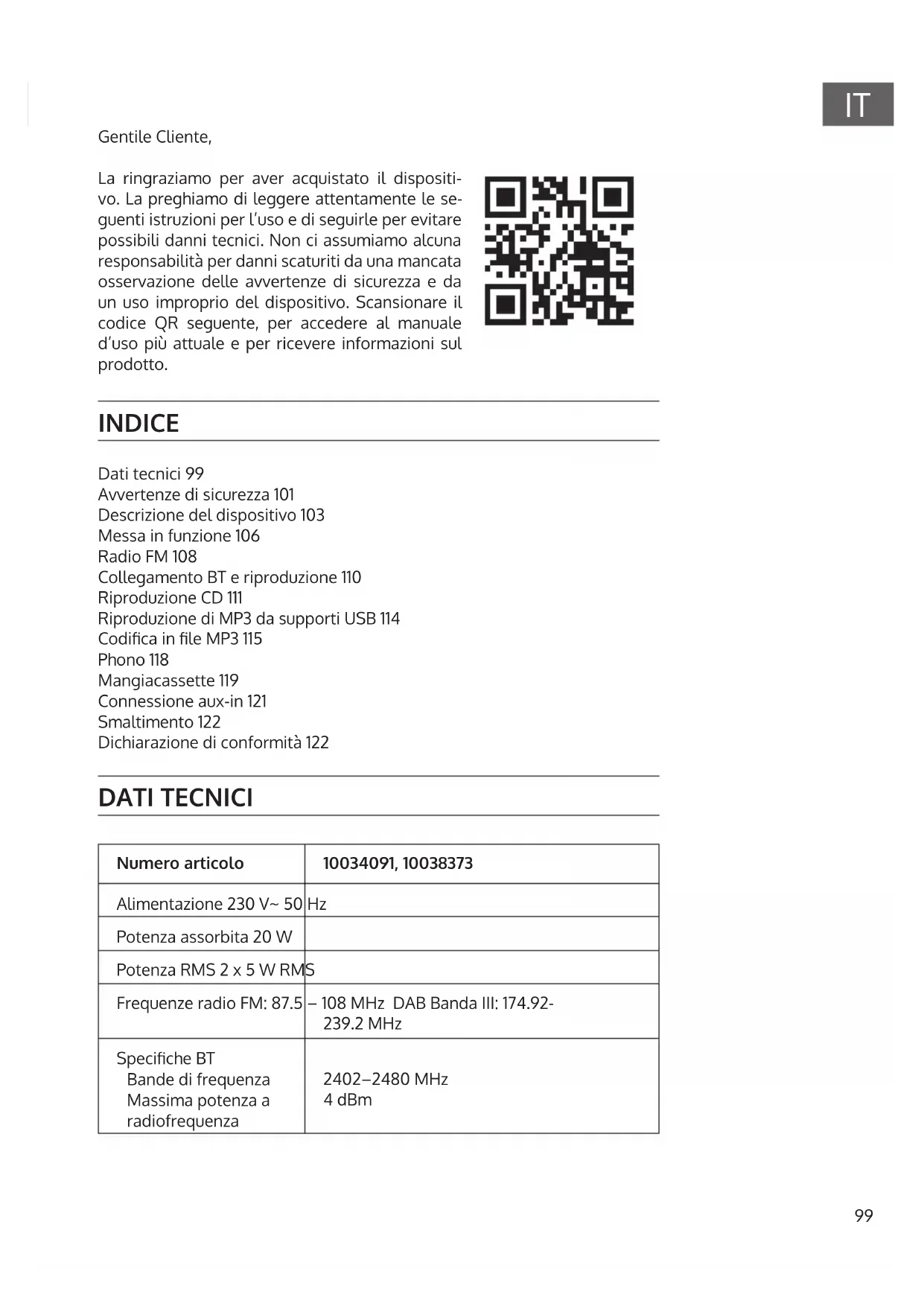 INDICE Dati tecnici 99 Avvertenze di sicurezza 101 Descrizione del dispositivo 103 Messa in funzione 106 Radio FM 108 Collegamento BT e riproduzione 110 Riproduzione CD 111 Riproduzione di MP3 da supporti USB 114 Codica in le MP3 115 Phono 118 Mangiacassette 119 Connessione aux-in 121 Smaltimento 122 Dichiarazione di conformità 122 DATI TECNICI Numero articolo 10034091, 10038373 Alimentazione 230 V~ 50 Hz Potenza assorbita 20 W Potenza RMS 2 x 5 W RMS Frequenze radio FM: 87.5 – 108 MHz DAB Banda III: 174.92-
